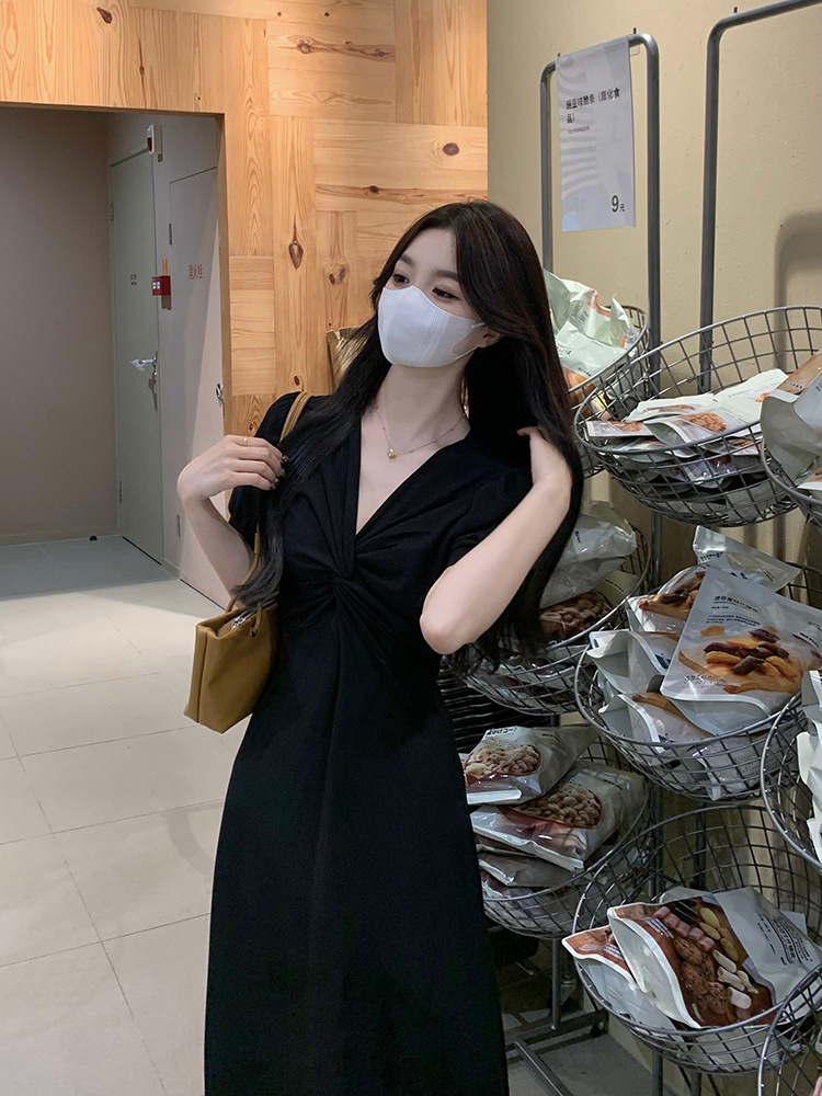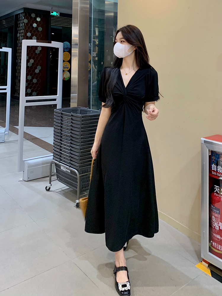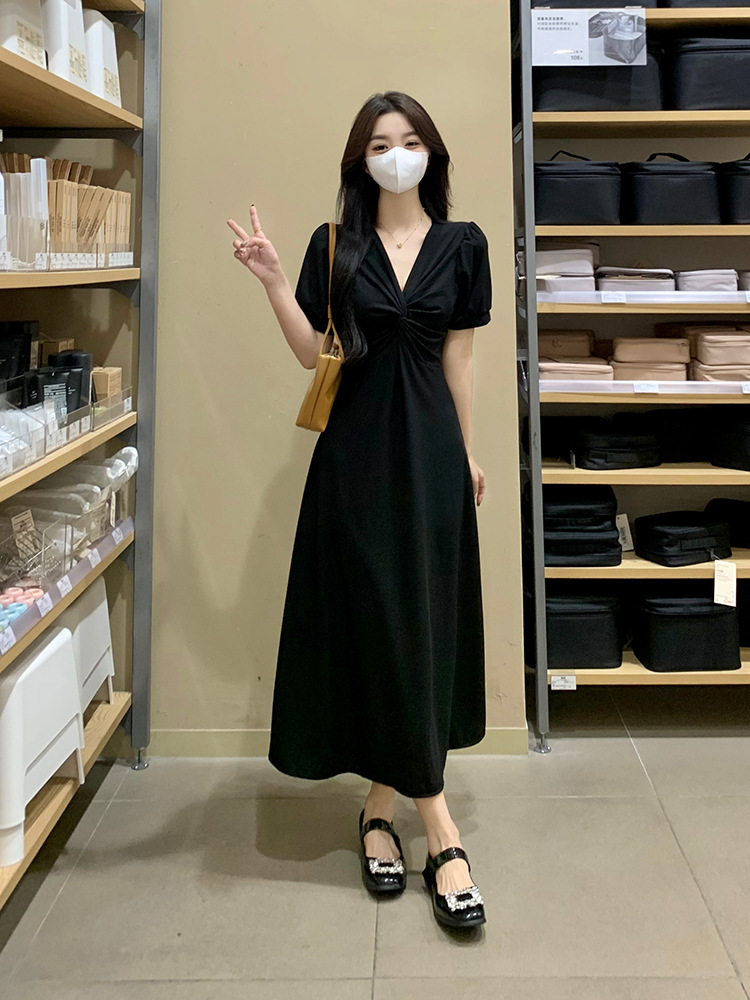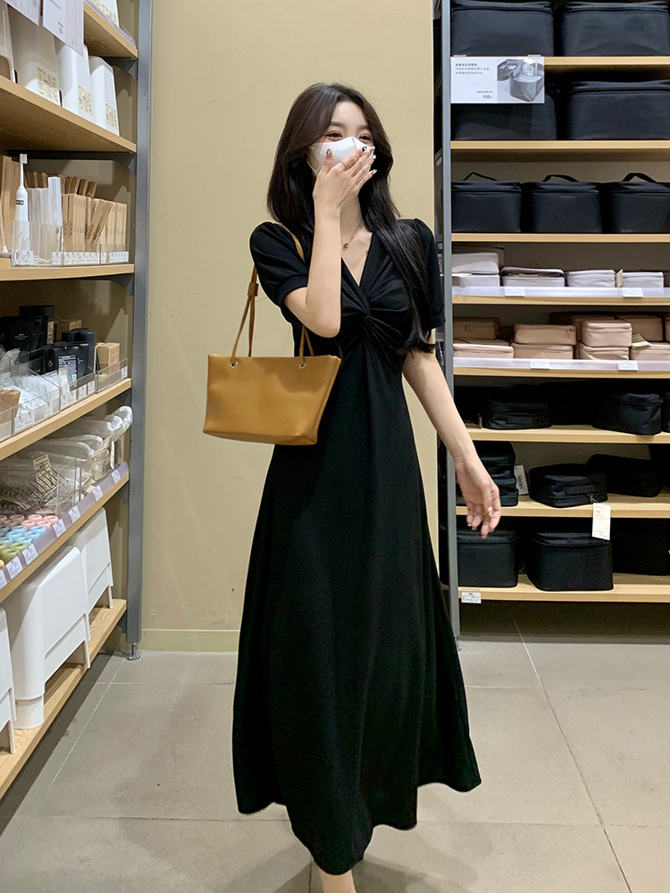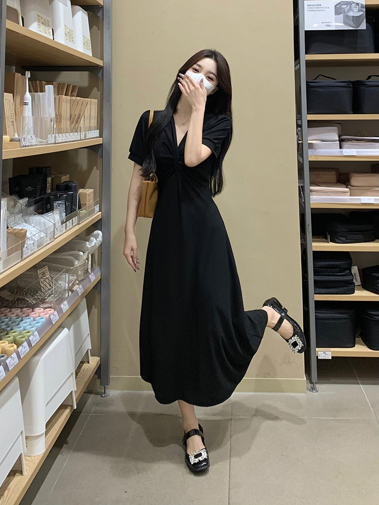 여름 느낌의 여성용 빅사이즈 블랙 브이넥 니트 드레스, 뚱뚱한 mm를 위한 배를 커버하고 날씬해 보이는 A라인 롱 스커트스토어 가기