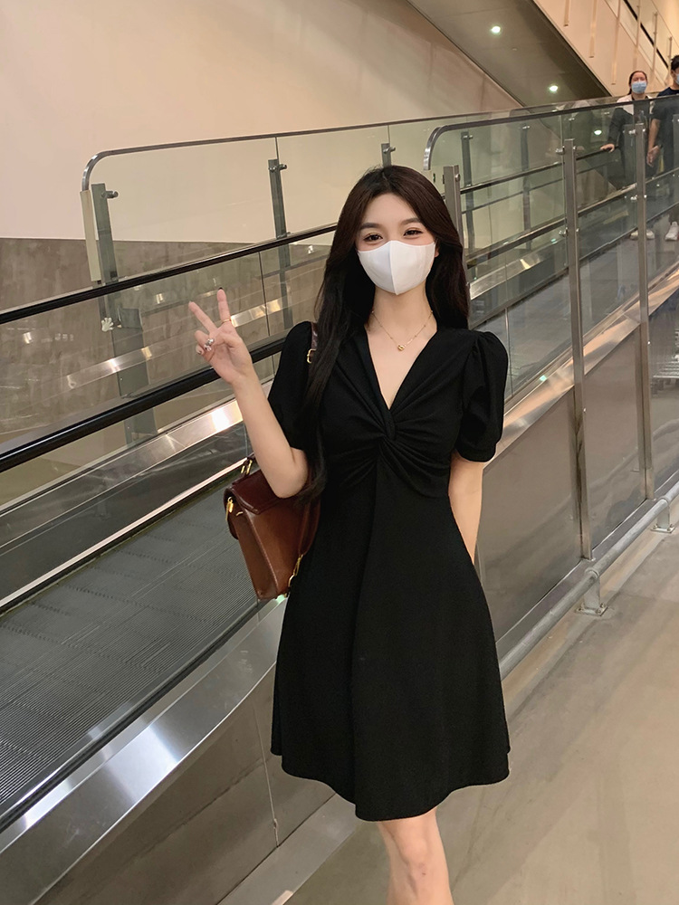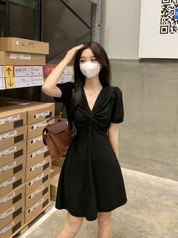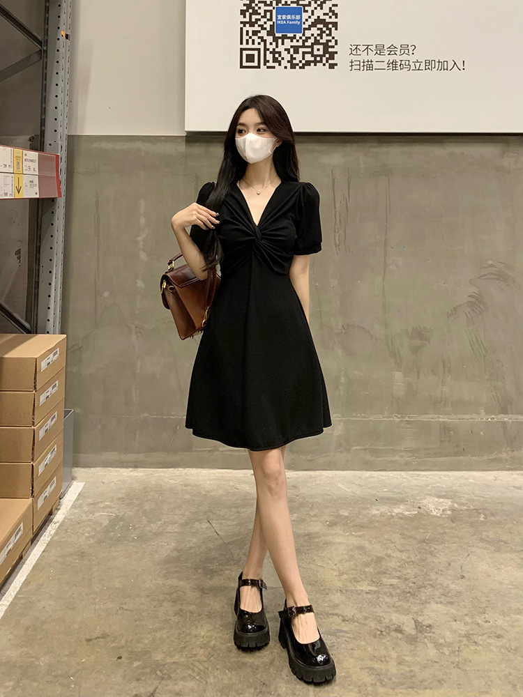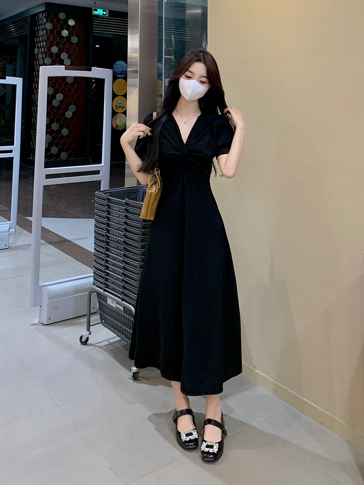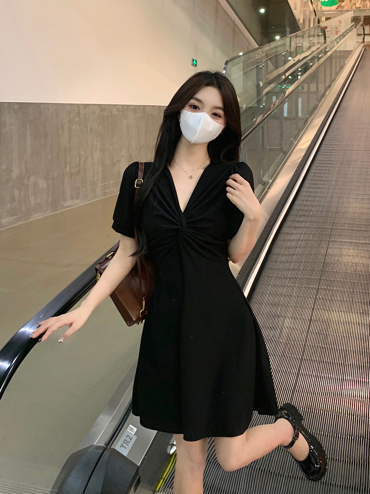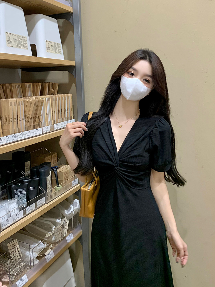 여름 느낌의 여성용 빅사이즈 블랙 브이넥 니트 드레스, 뚱뚱한 mm를 위한 배를 커버하고 날씬해 보이는 A라인 롱 스커트스토어 가기