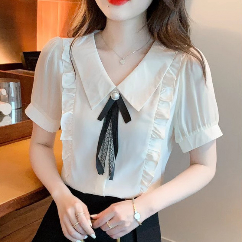 프렌치 인형 칼라 반팔 쉬폰 셔츠 여성 여름 착용 2025 여름 새로운 디자인 퍼프 슬리브 셔츠 탑