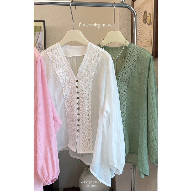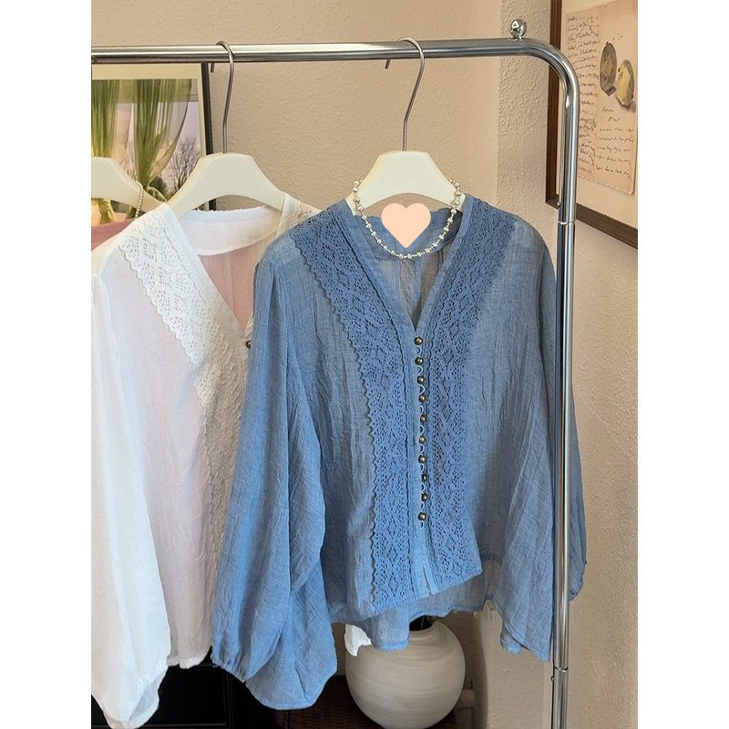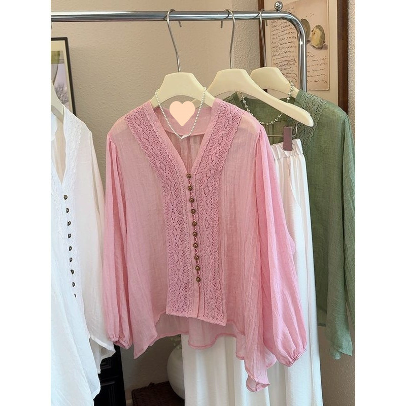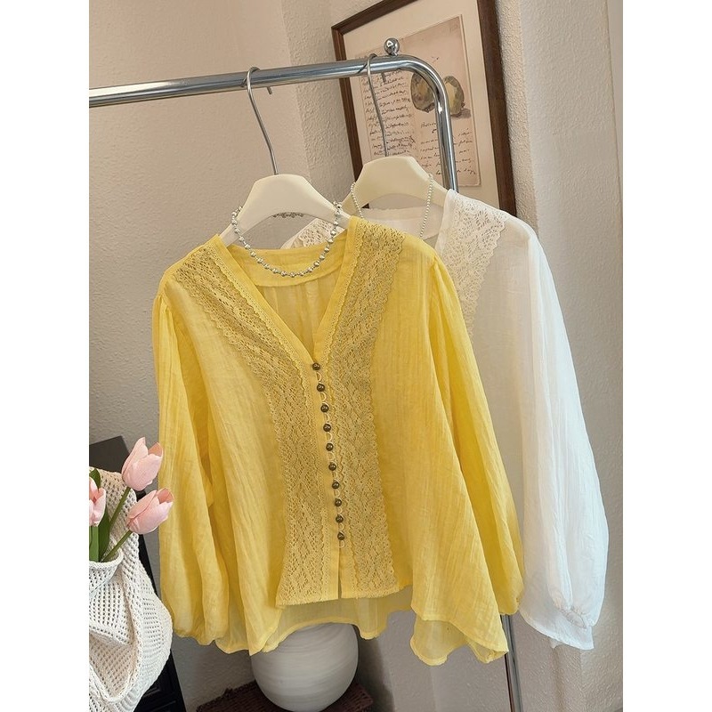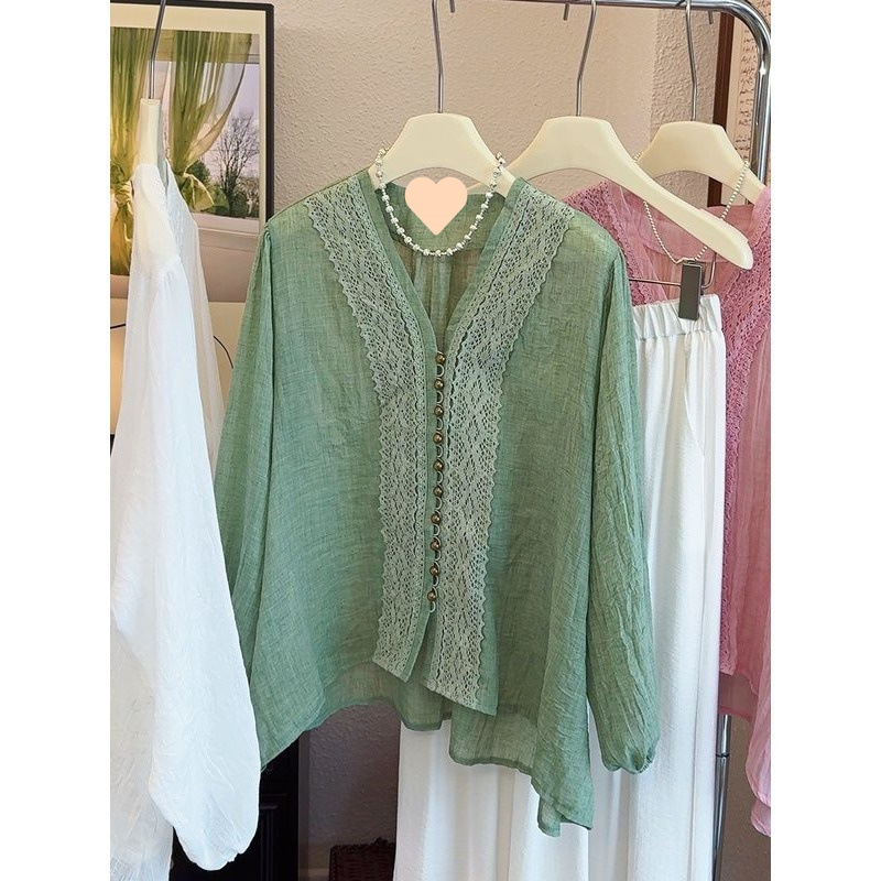 V领蕾丝边雪纺衬衫女2025夏季大码胖mm薄款外搭正肩开衫防晒上衣