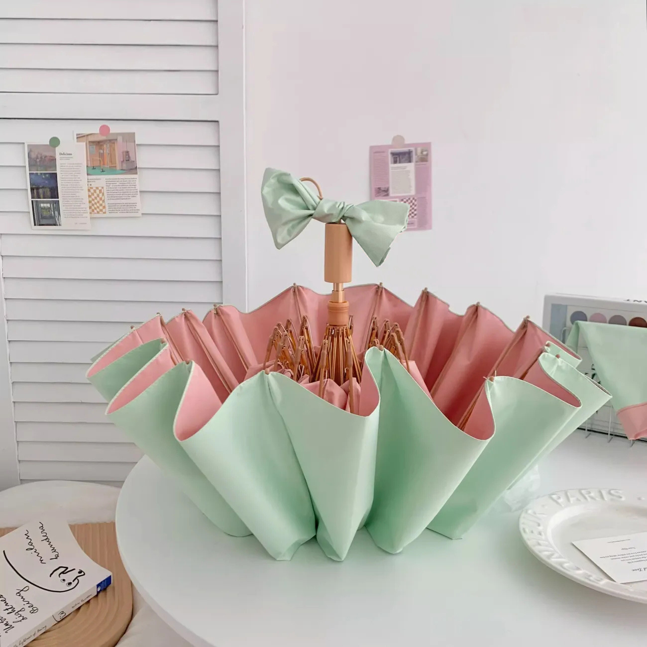 • [비 오는 날 파트너] 16본 치즈 민트 모조 나무 손잡이 + 더블 챙 비옷 [비고 잊지 마세요~]