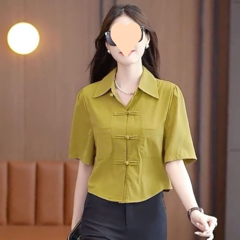 여성을위한 유럽 복고풍 쉬폰 셔츠 여름 2025 새로운 스타일 중국 스타일 버튼 셔츠 퍼프 슬리브 짧은 탑 솔리드 컬러