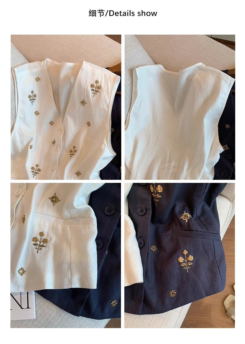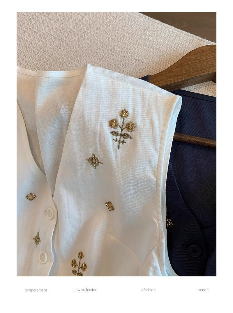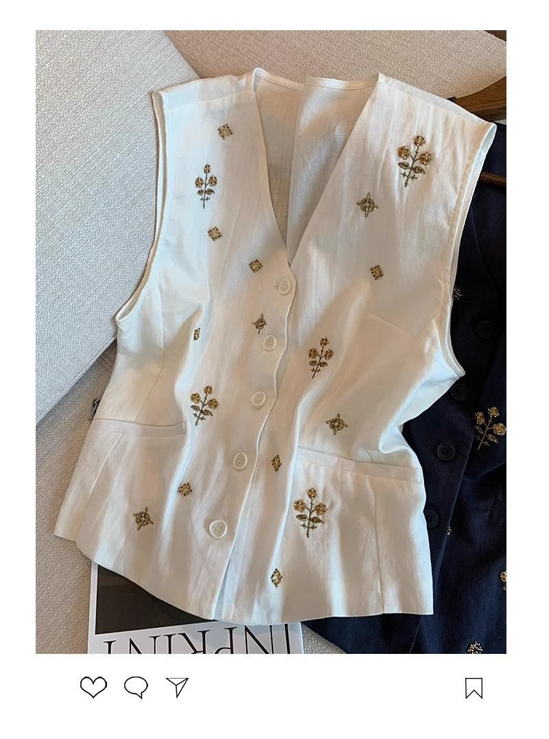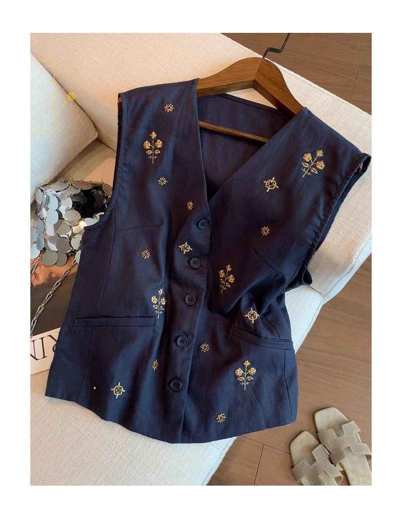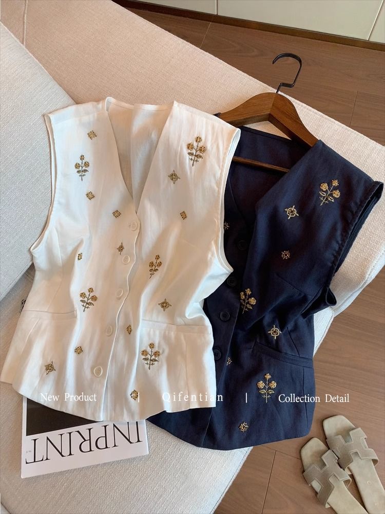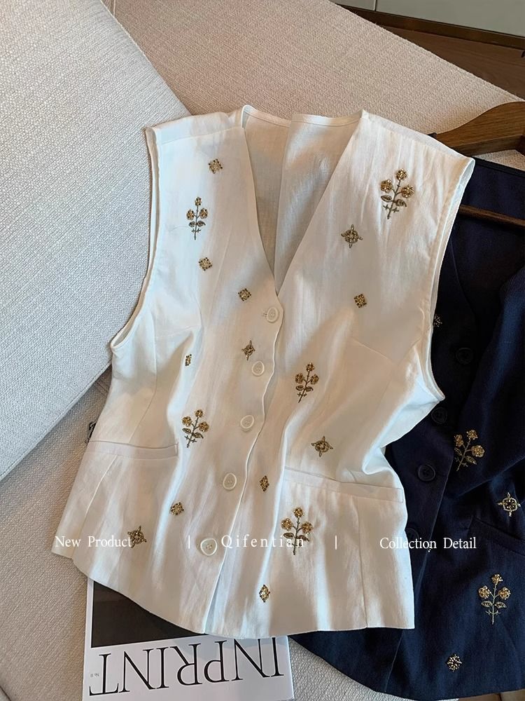 여성을위한 올드 머니 스타일 자수 민소매 탑 2025 여름 하이 엔드 기질 느슨하고 다재다능한 v 넥 패션 조끼