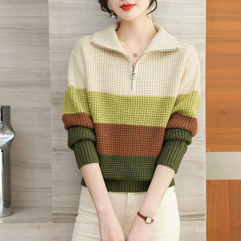 여성을 위한 새로운 가을 겨울 의류 하프 지퍼 라펠 스웨터, 게으른 스타일의 두꺼운 대비 색상 스웨터, 느슨한 줄무늬 바닥 셔츠스토어 가기