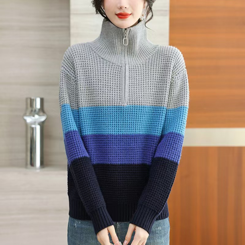 여성을 위한 새로운 가을 겨울 의류 하프 지퍼 라펠 스웨터, 게으른 스타일의 두꺼운 대비 색상 스웨터, 느슨한 줄무늬 바닥 셔츠