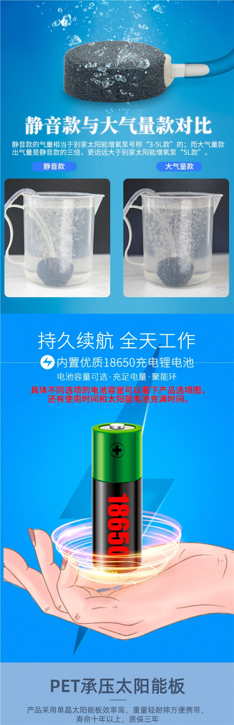 • 듀얼 리튬 배터리 태양광 산소 펌프 무소음 3L 공기량 7일 연속✓