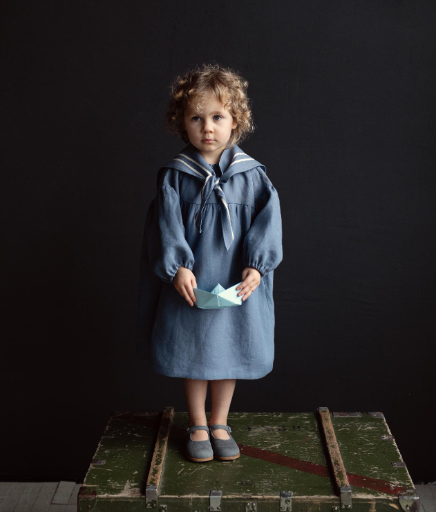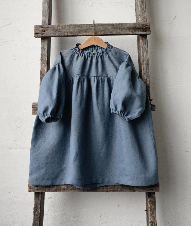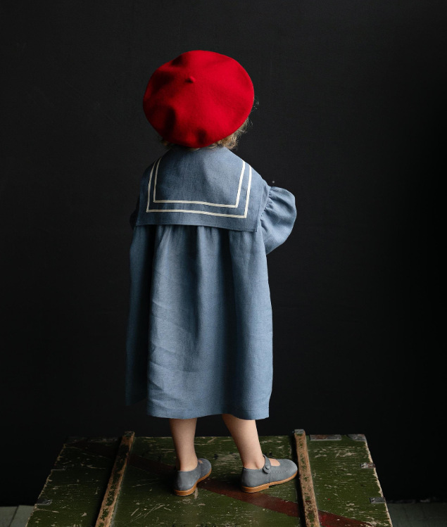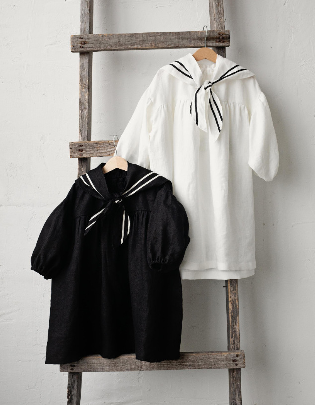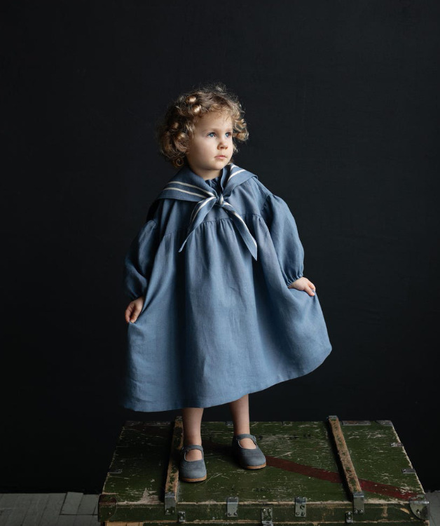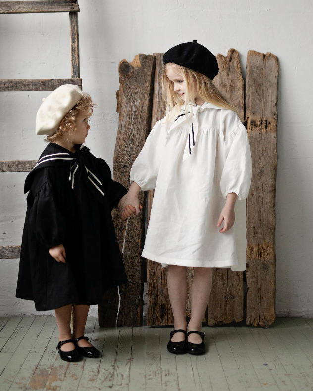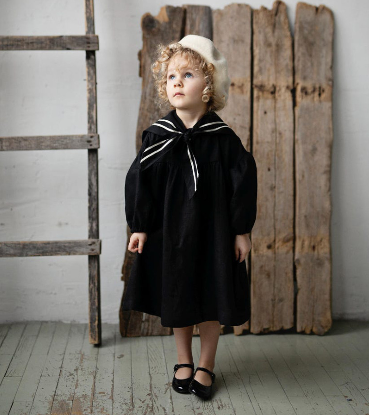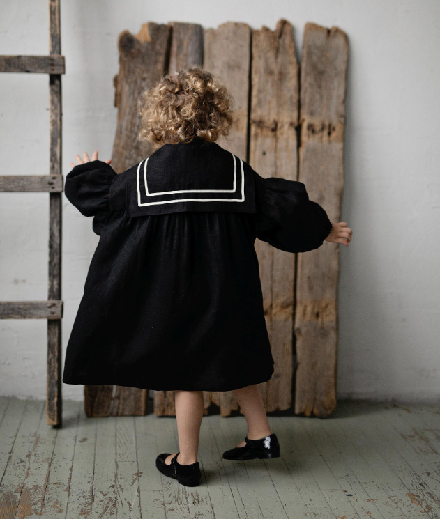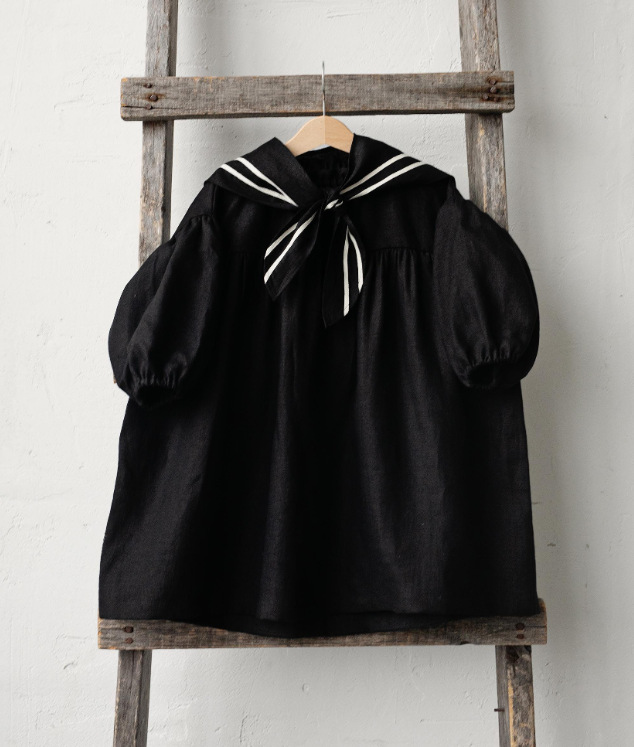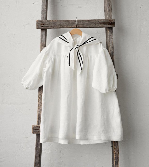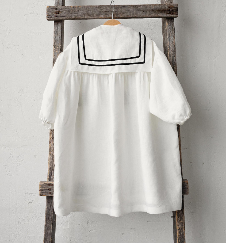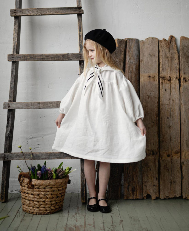 2025 ins 북유럽 소녀 리넨 봄, 가을 캐주얼 퍼프 슬리브 영국 해군 칼라 아동 미국 드레스스토어 가기
