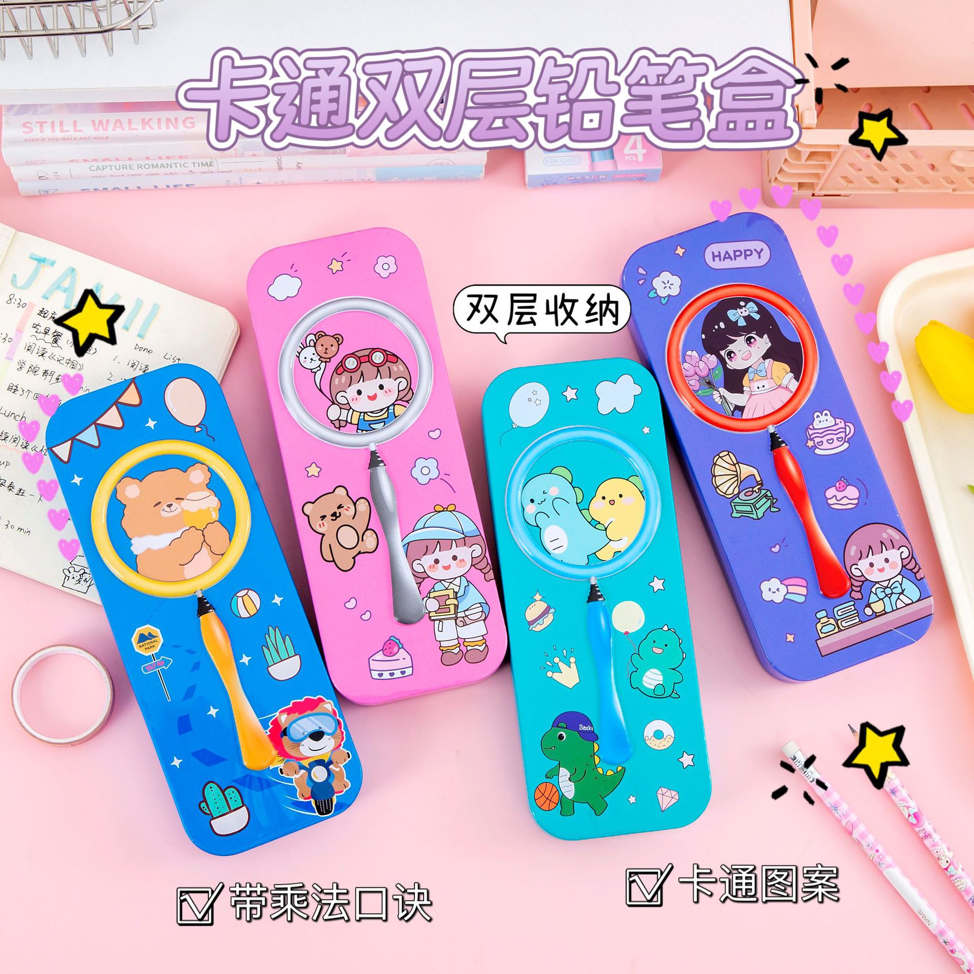 초등학생을위한 철제 더블 레이어 문구 상자 소녀와 소년을위한 유치원 가방 소년 소녀 연필 상자 대용량 문구스토어 가기