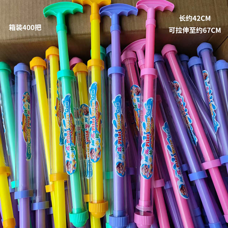 400把一箱,尺寸:长约42CM,可拉伸至约67CM。手柄宽约7.5cm,水管直径约3cm,颜色随机发!!!水枪上的贴纸图案可能会因为批次不同而不同,介意勿买,跨境找不同的勿扰,谢谢!!!