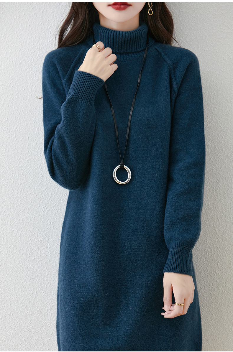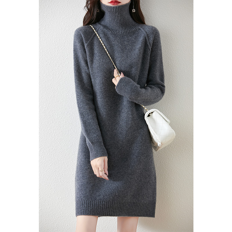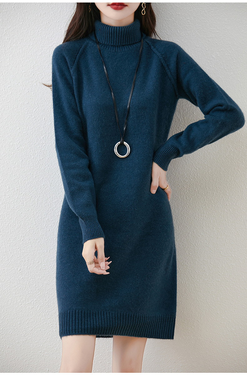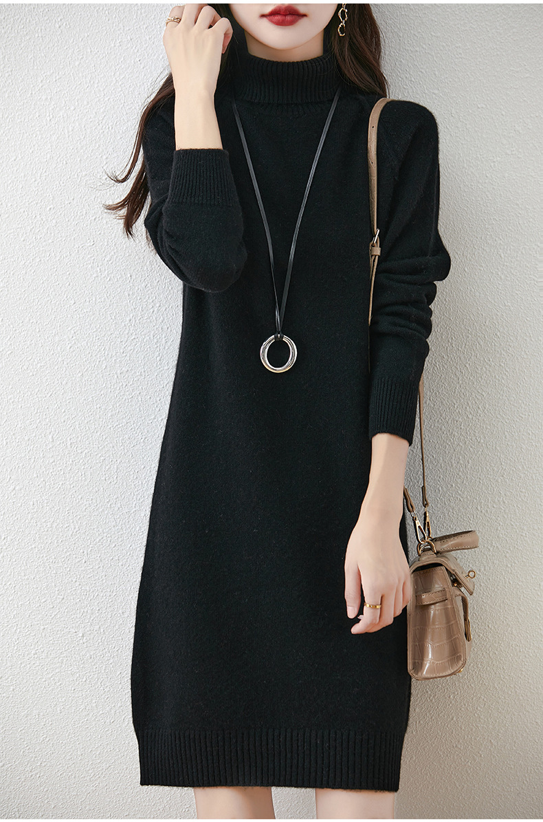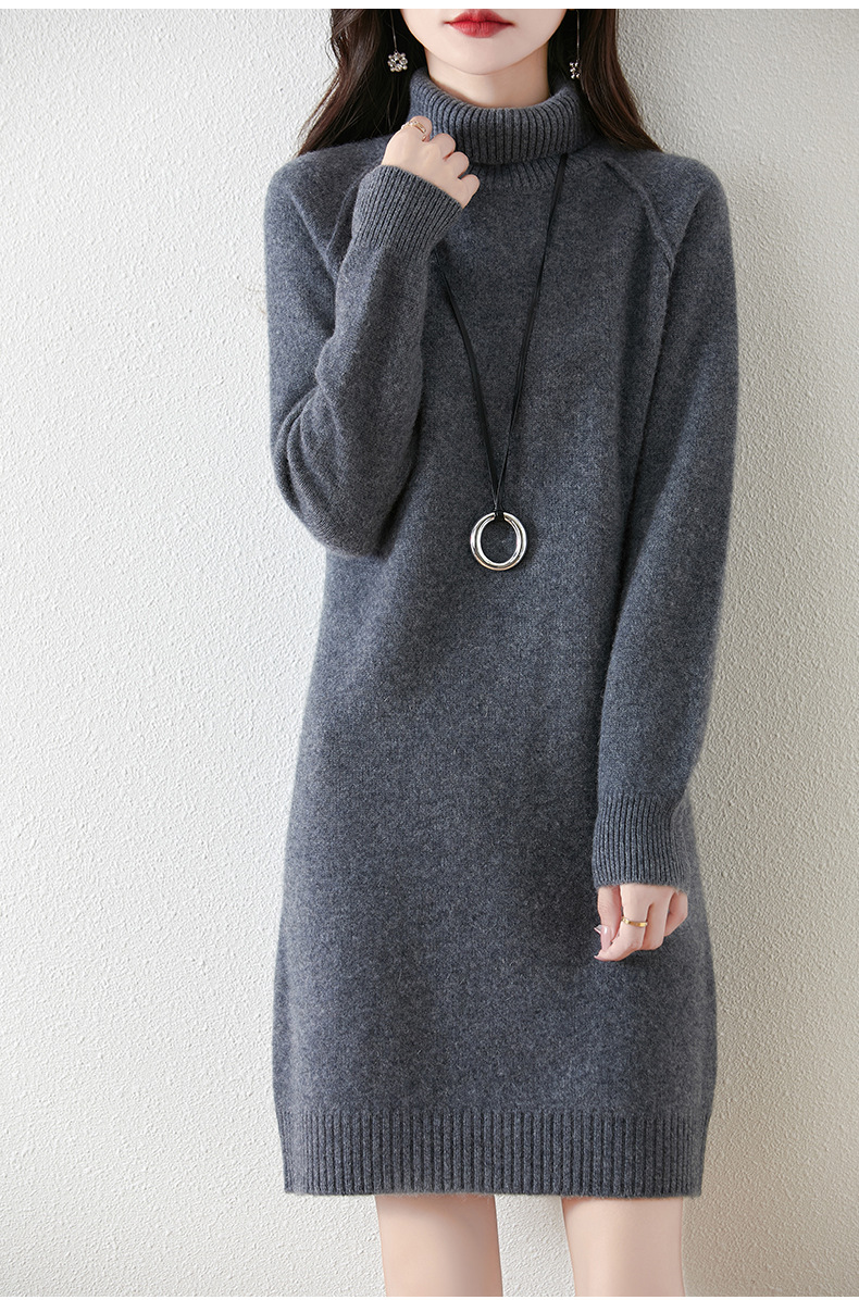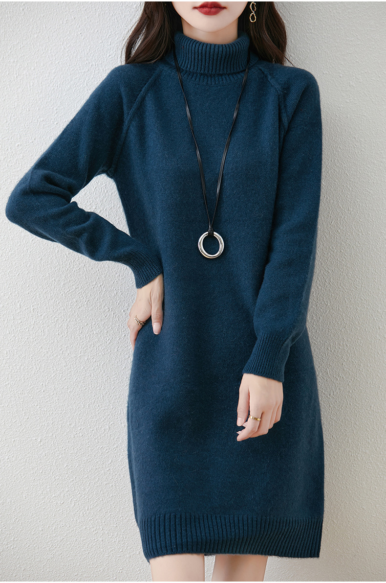 가을, 겨울 두꺼운 솔리드 컬러 드레스 게으른 스타일 하이 라펠 여성 니트 중간 길이 느슨한 라글란 슬리브 스웨터 드레스