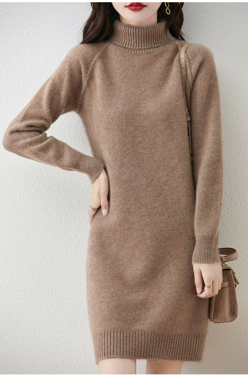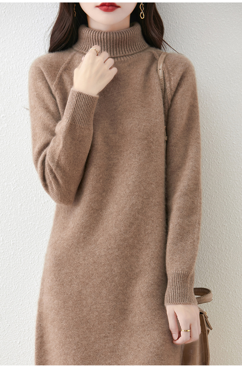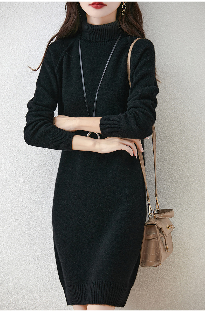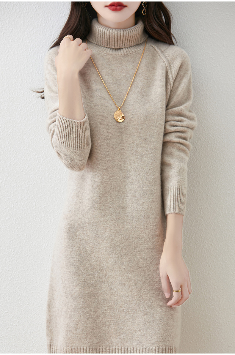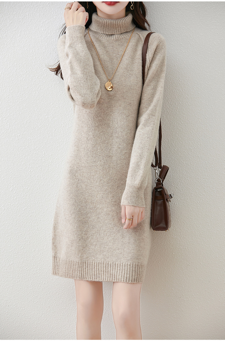 가을, 겨울 두꺼운 솔리드 컬러 드레스 게으른 스타일 하이 라펠 여성 니트 중간 길이 느슨한 라글란 슬리브 스웨터 드레스