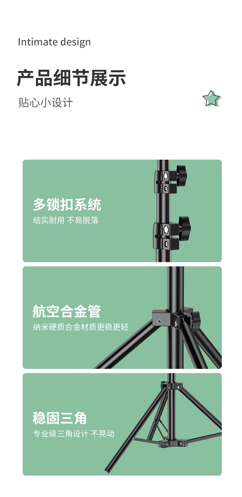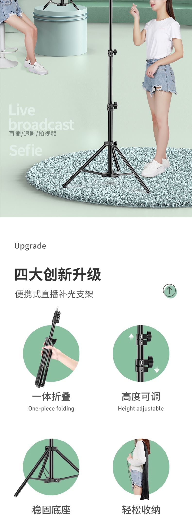 • 2.1m [업그레이드된 합금 스탠드] 10inch 조명 + 마이크 스탠드 + 싱글 카메라 + 셀카 + 보관 가방