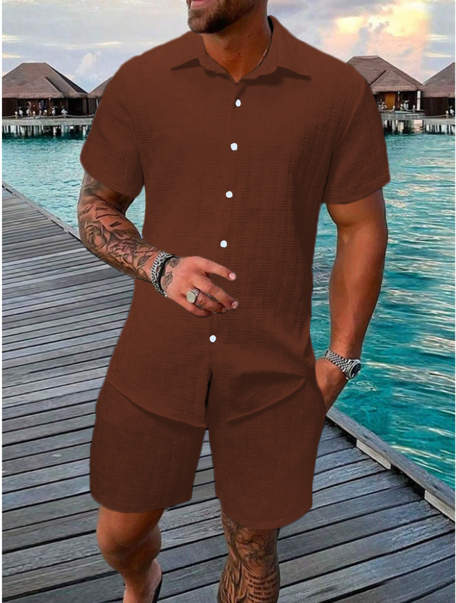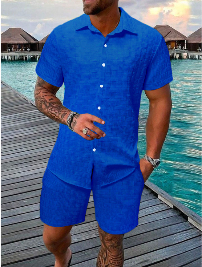 2026년 유럽 및 미국 해외 시장 신상 여름 데일리 캐주얼 휴가용 단색 버튼 라펠 셔츠 반바지 세트 남성복스토어 가기