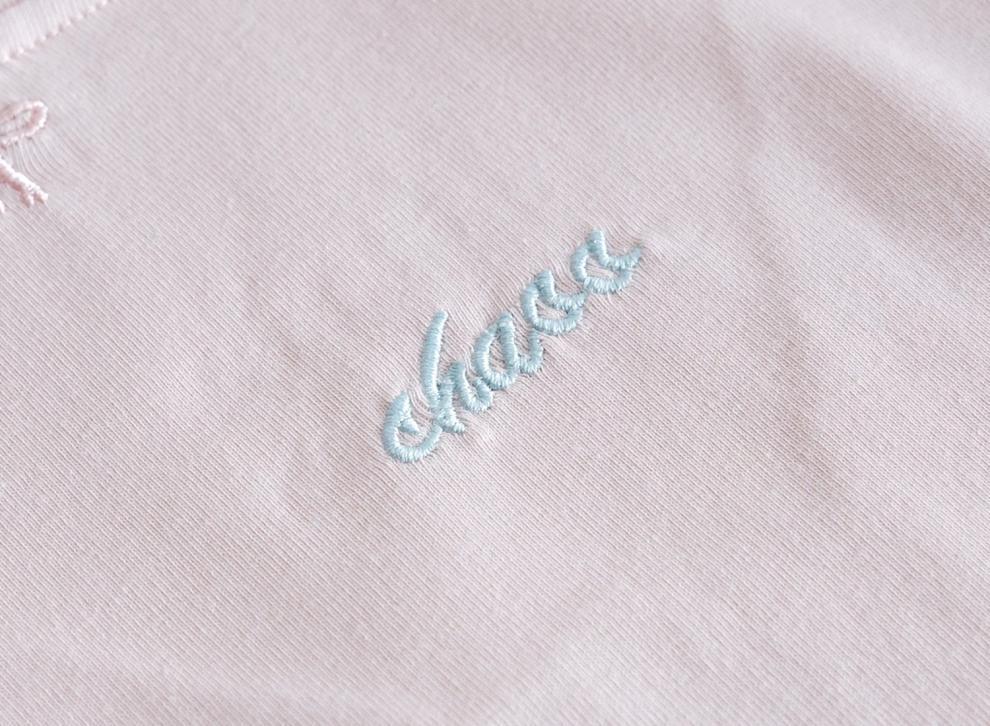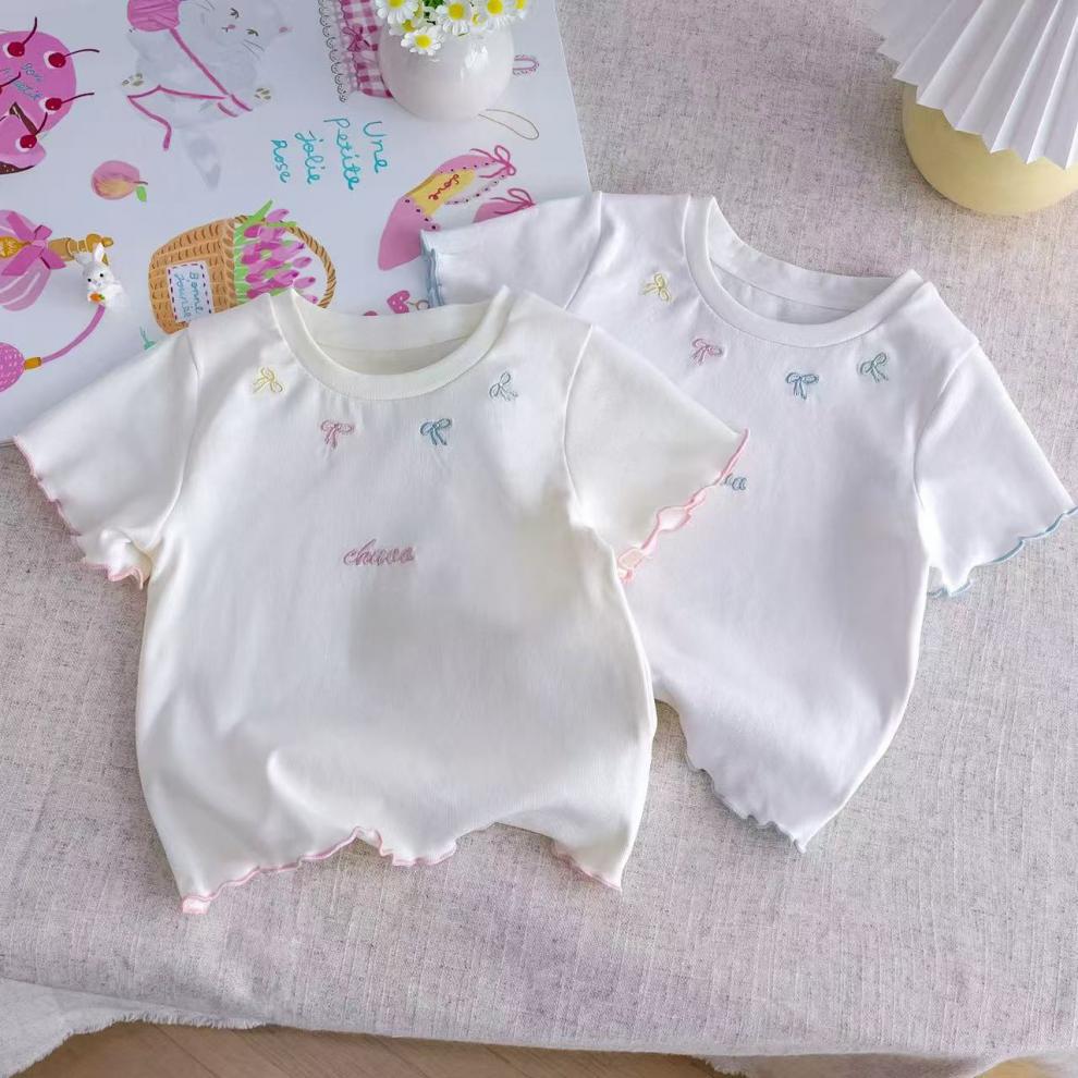 여아의 달콤한 반팔 여름 신작 스타일 자수 리본 귀 레이스 슬리브 티셔츠 다용도 베이스 탑스토어 가기