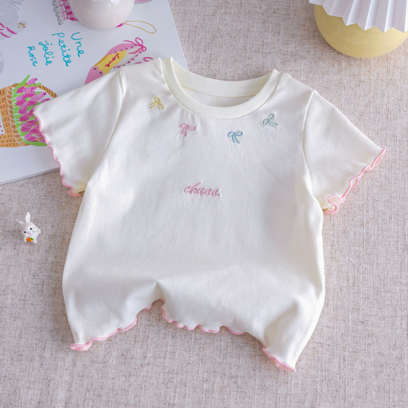 여아의 달콤한 반팔 여름 신작 스타일 자수 리본 귀 레이스 슬리브 티셔츠 다용도 베이스 탑