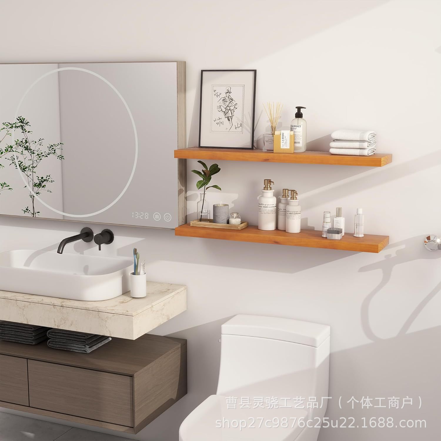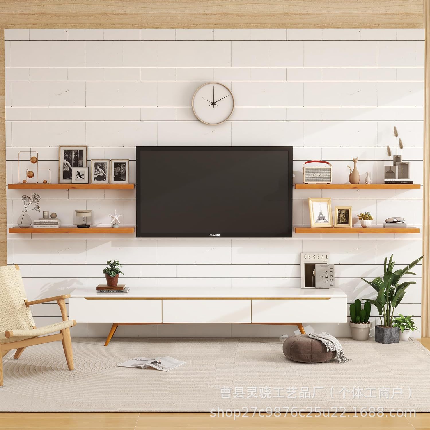 유럽 스타일의 벽에 단단한 나무 선반 거실 선반 매니큐어 펀치없는 랙 TV 배경 벽 장식스토어 가기