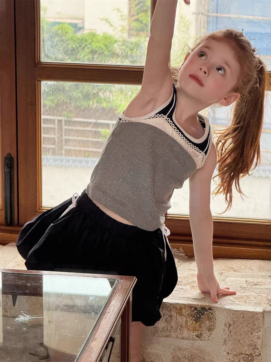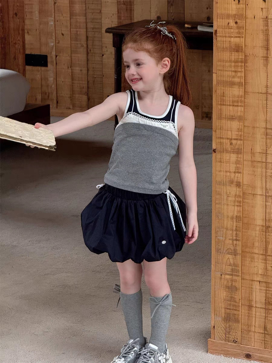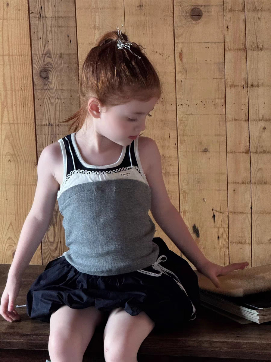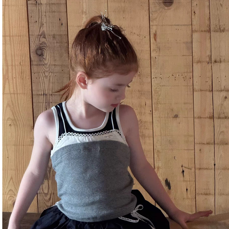 여아 여름 정장 miu 스타일 여아 패션 가짜 투피스 컬러 블록 캐미솔 아동용 레이스 버드 스커트 트렌디스토어 가기