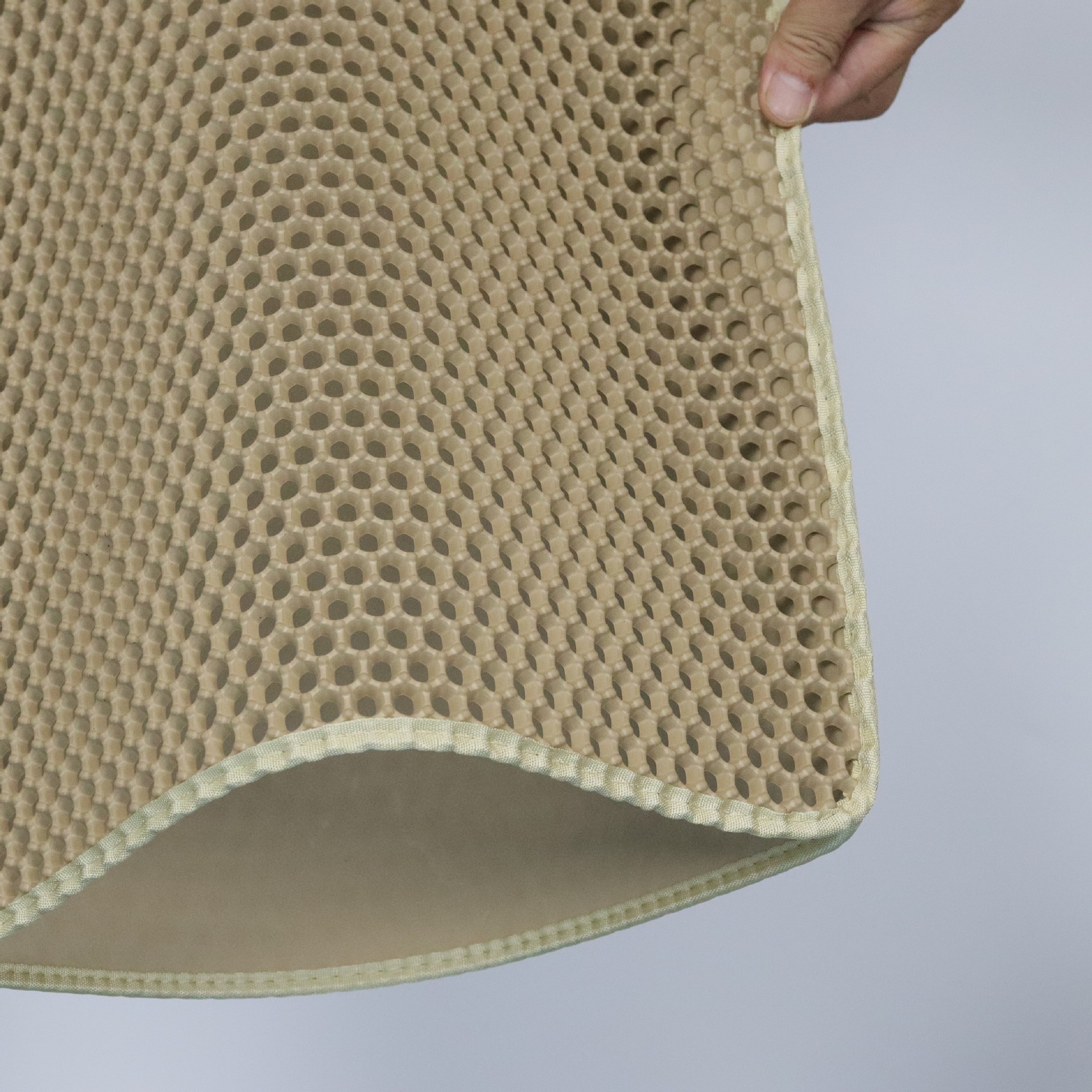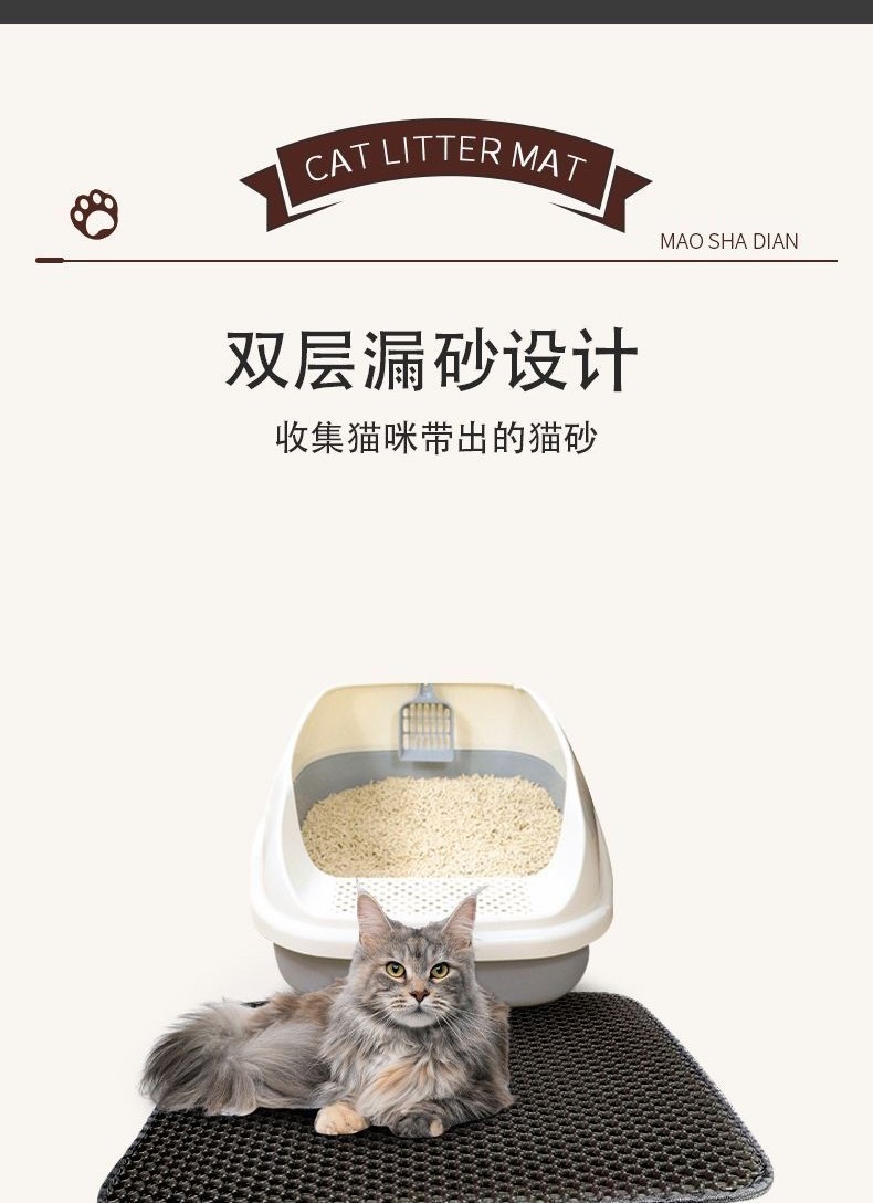产品功能:适用95%以上种类的猫砂,上层通孔材料,猫砂可轻易通过,下层防水材质,猫砂、小便等脏物可聚集于此。猫砂垫为上下双层设计:上层采用六角形的洞孔凹凸设计,除了让猫砂落入后不再外溅,圆球型的柔滑触感也可以避免猫咪抓坏,下层垫密封专门存放猫砂,底部设计成规则性的圆孔,有效防滑避免横冲直撞的猫咪滑到受伤。采用单边开口设计,能轻松倒出猫砂,完全不麻烦,更不会手忙脚乱,更棒的是猫砂再利用,清洁的同时又省钱。材质精选高弹力的EVA材料, EVA特性为无毒、柔软、可水洗、不闷热,适合喜欢柔软触感的猫咪。尺寸手工测量存在误差1cm。颜色,款式,尺寸可定制。