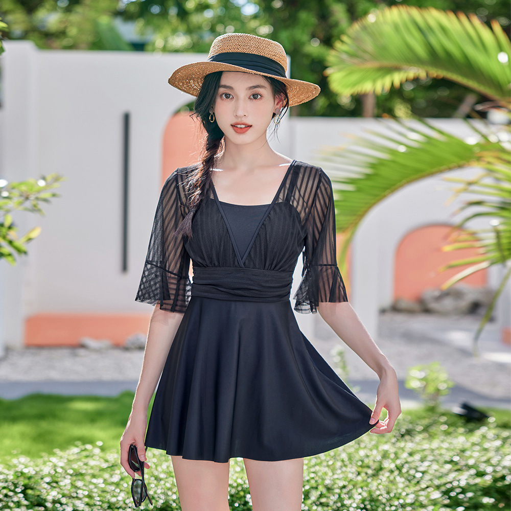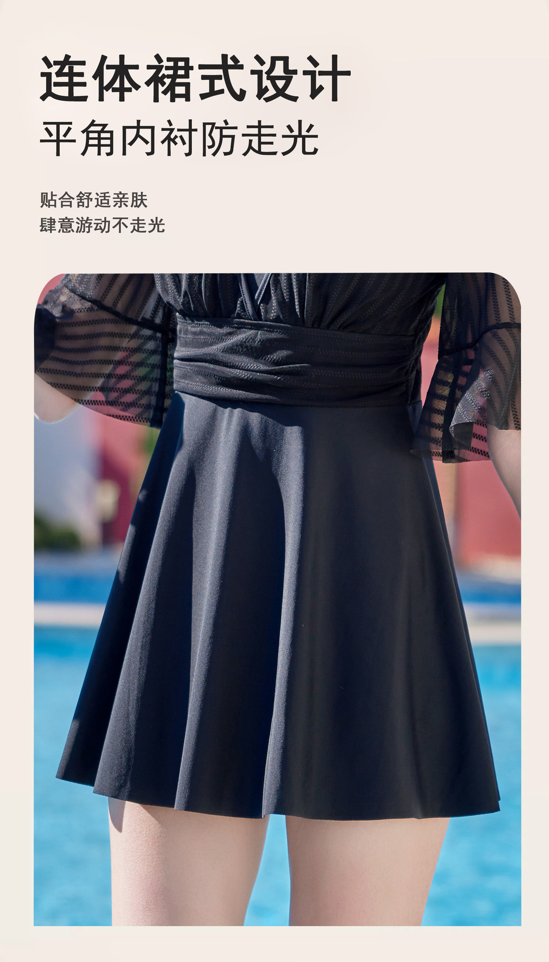 30년 수영복 25 패션 블랙 여성 드레스 수영복 스트라이프 레이스 미드 슬리브 복서 수영복 내부 패드