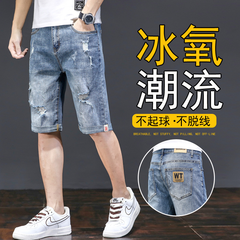 국경을 넘나드는 인기 남성 데님 반바지 트렌디 브랜드 루즈한 여름 얇은 캐주얼 찢어진 5부 남성용 중간 바지스토어 가기