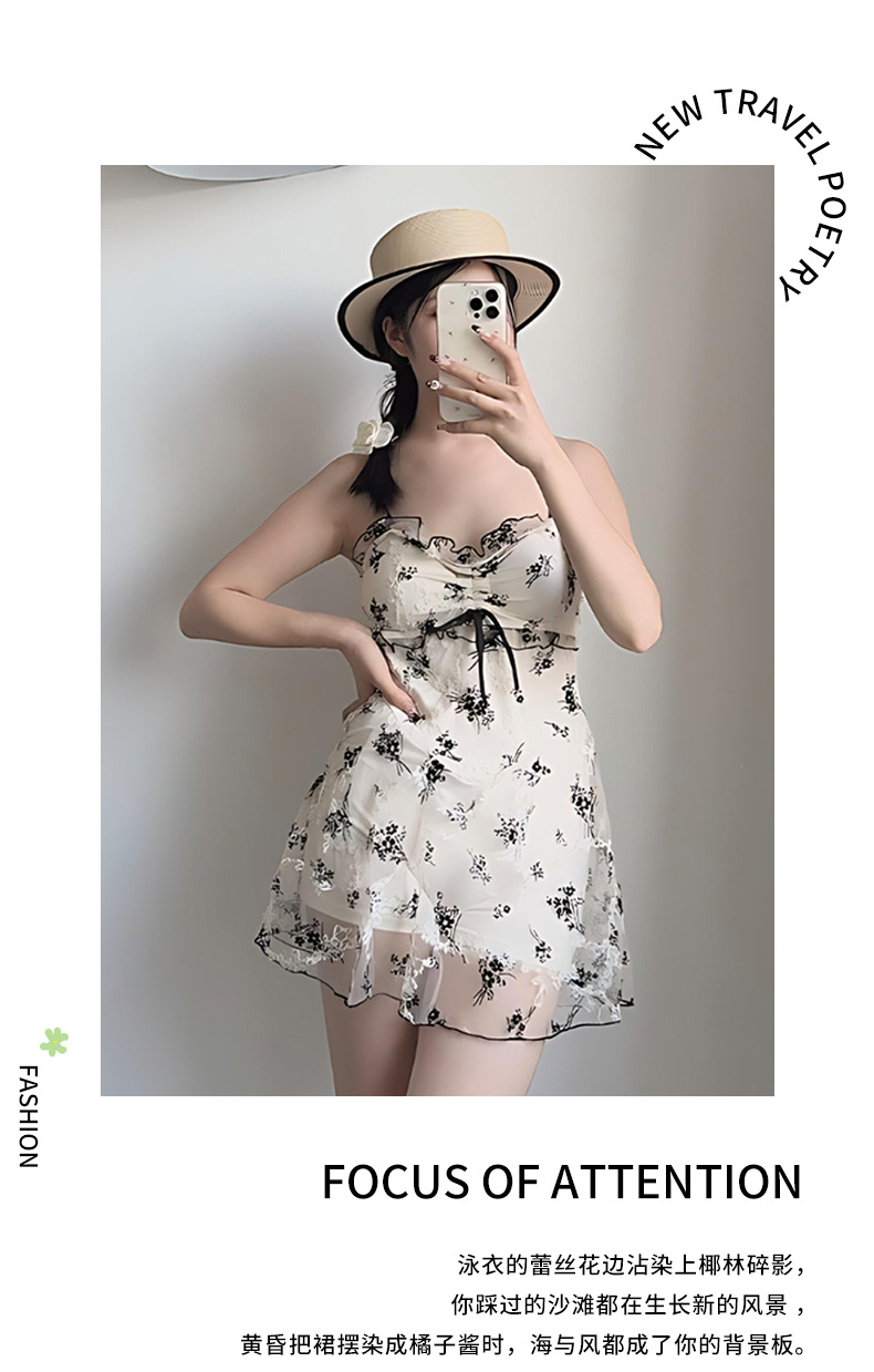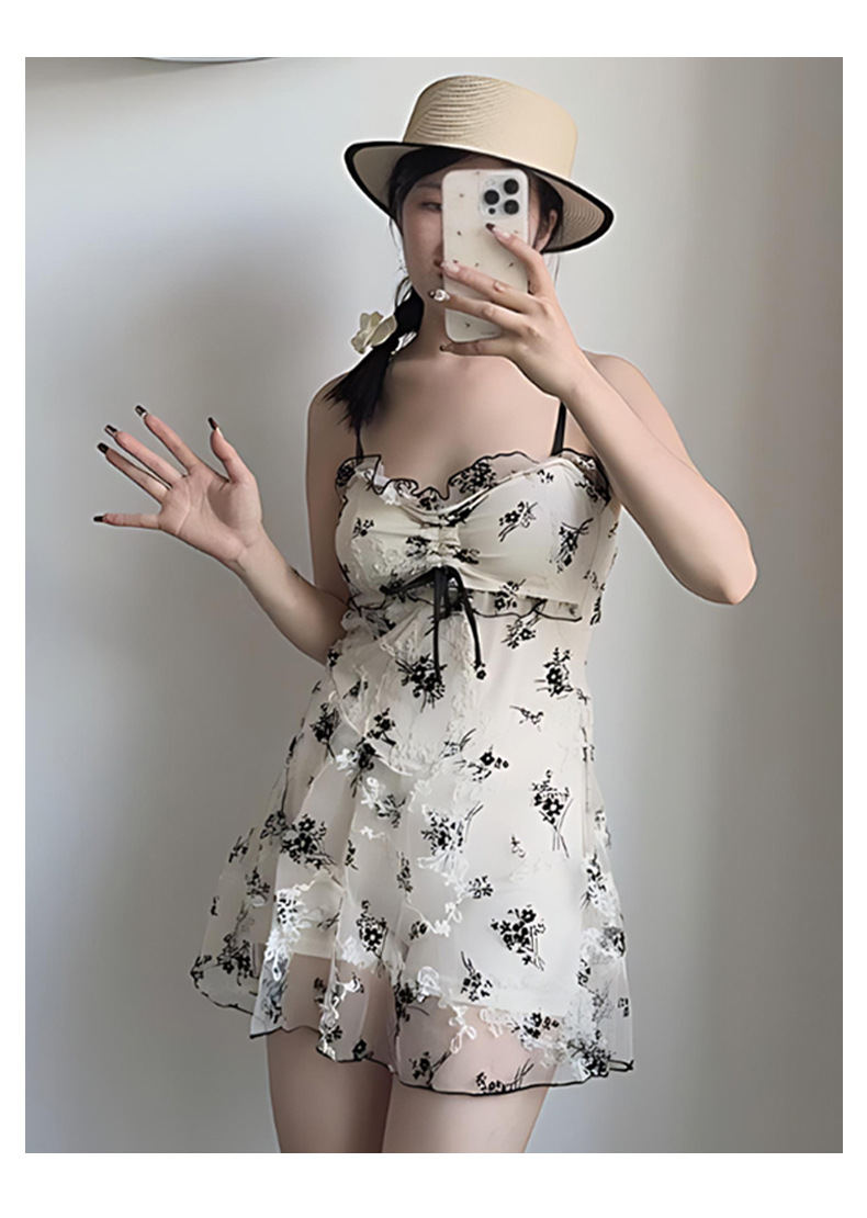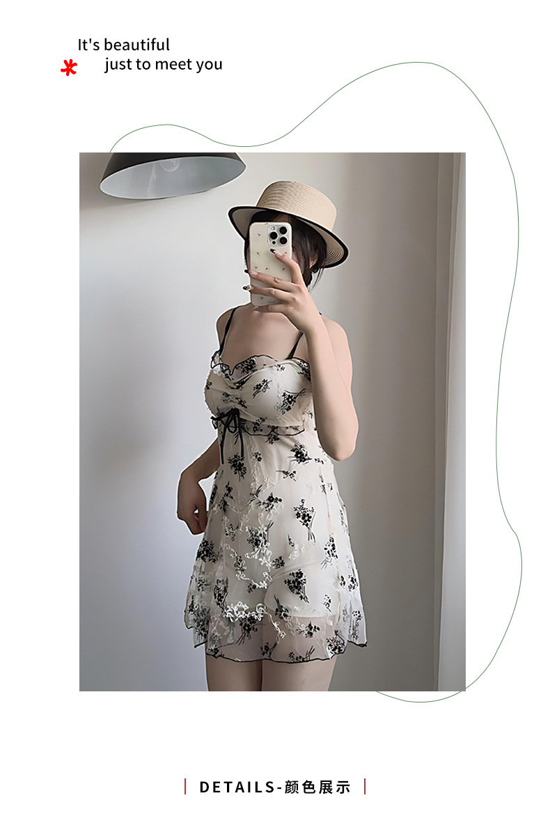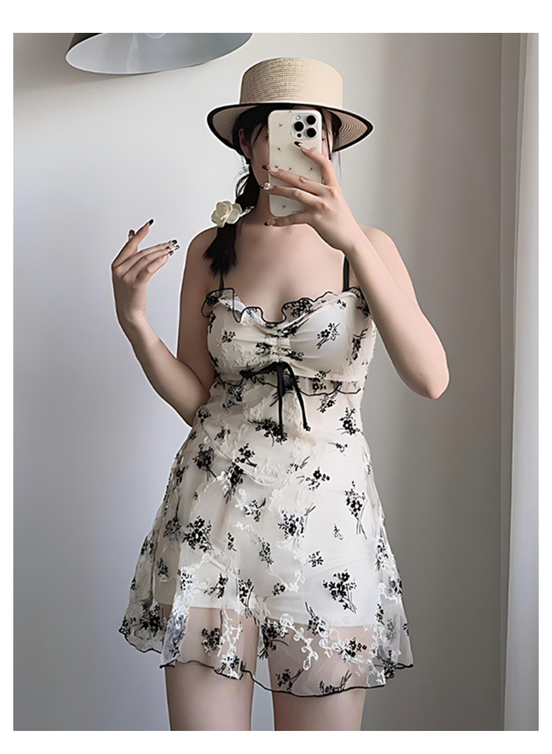 여성을위한 인기있는 순수한 욕망 스타일 메쉬 수영복 꽃 스트랩 서스펜더 원피스 스커트 스타일 온천 해변 휴가 수영복 도매스토어 가기
