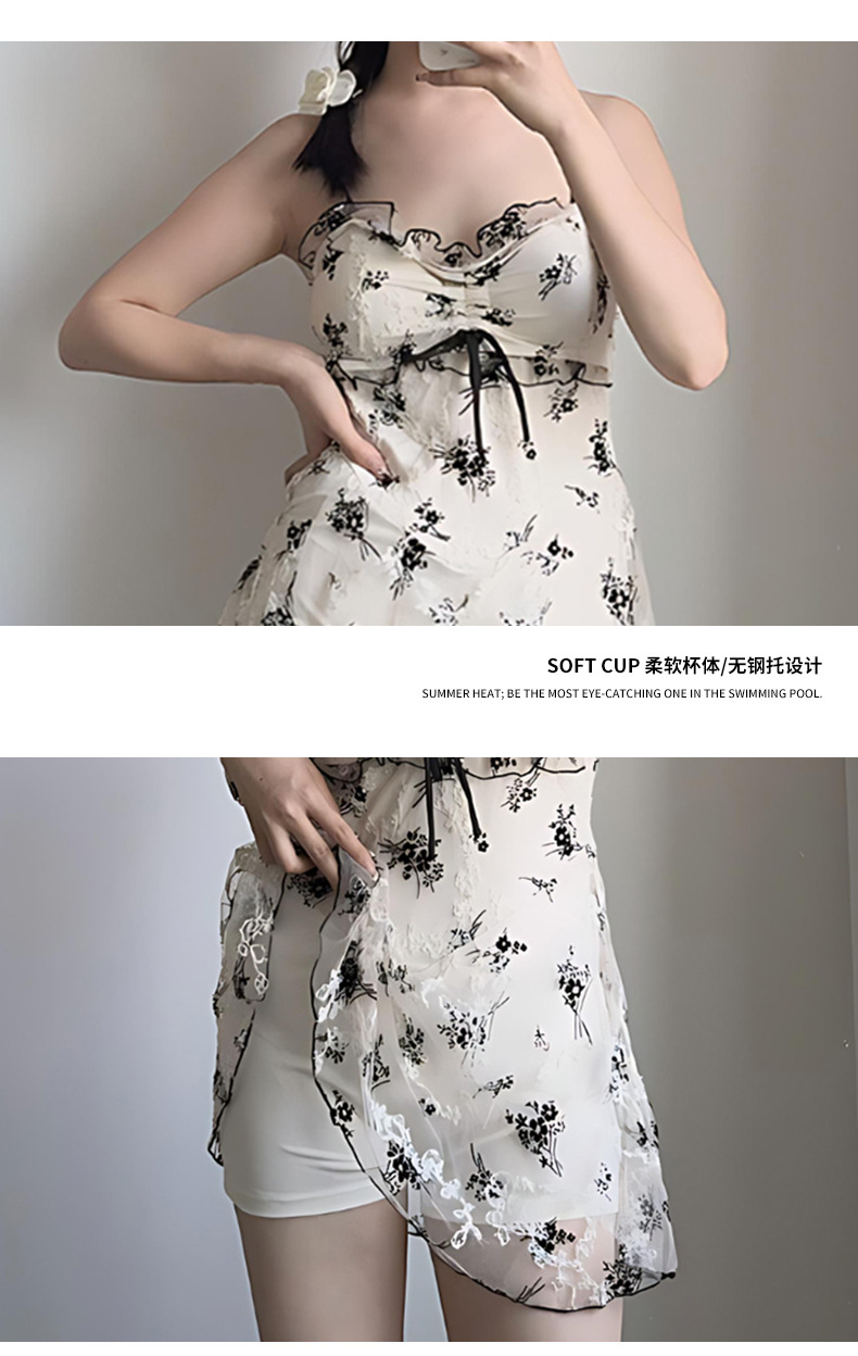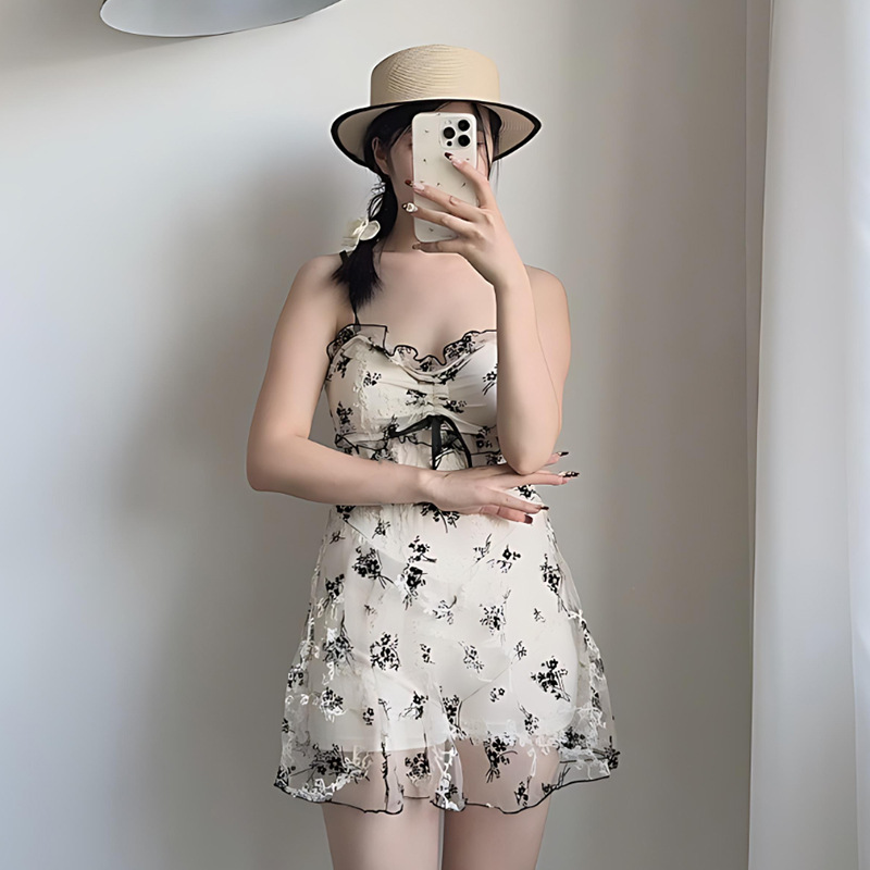 여성을위한 인기있는 순수한 욕망 스타일 메쉬 수영복 꽃 스트랩 서스펜더 원피스 스커트 스타일 온천 해변 휴가 수영복 도매