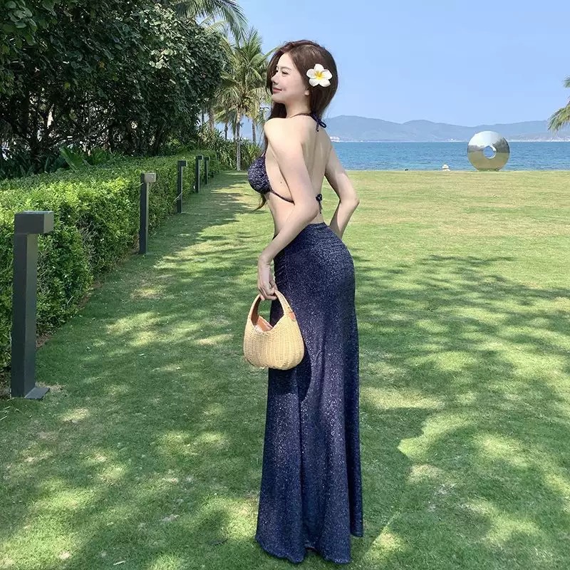 2025 새로운 반짝 이는 다섯개 별 섹시한 엉덩이 커버 롱 스커트 스플릿 수영복 핫 소녀 푸시 업 비키니 휴가 해변스토어 가기