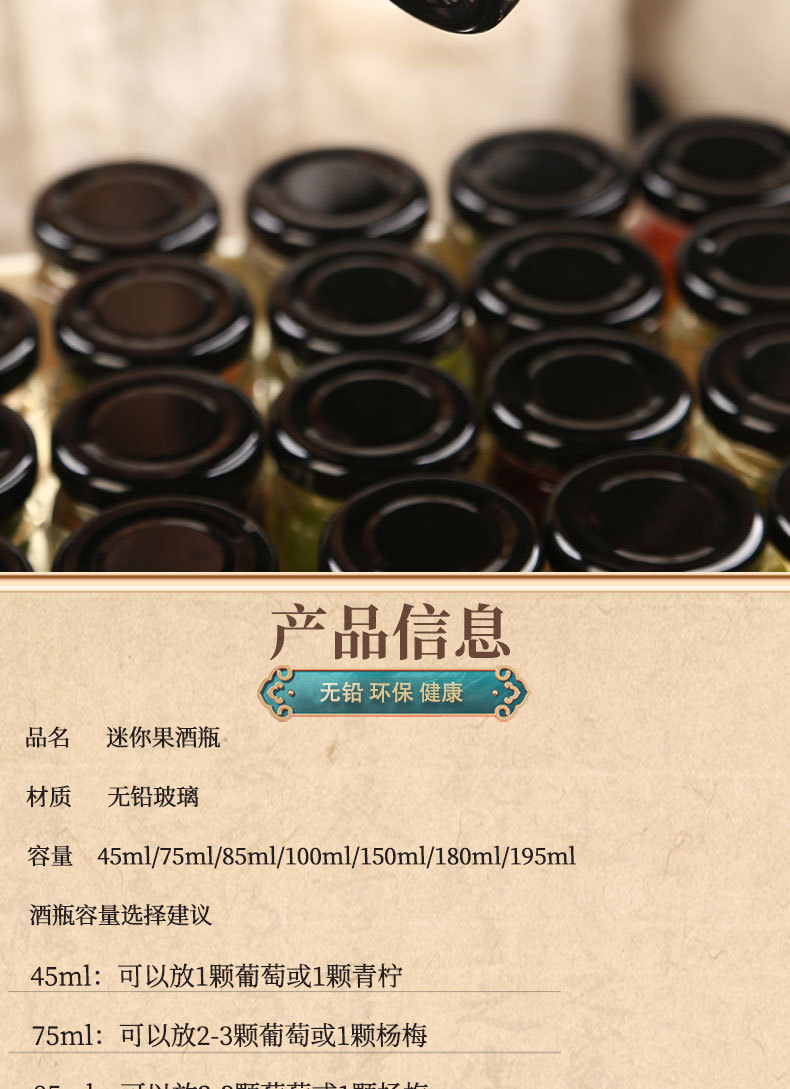 미니 유리병, 와인병, 빈병, 청매실과 매실주, 밀봉된 식품등급 절인 과일캔, 꿀