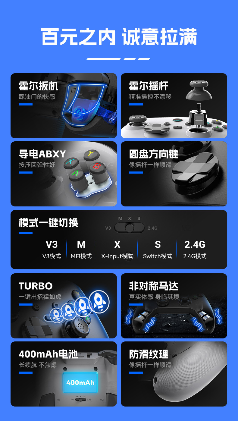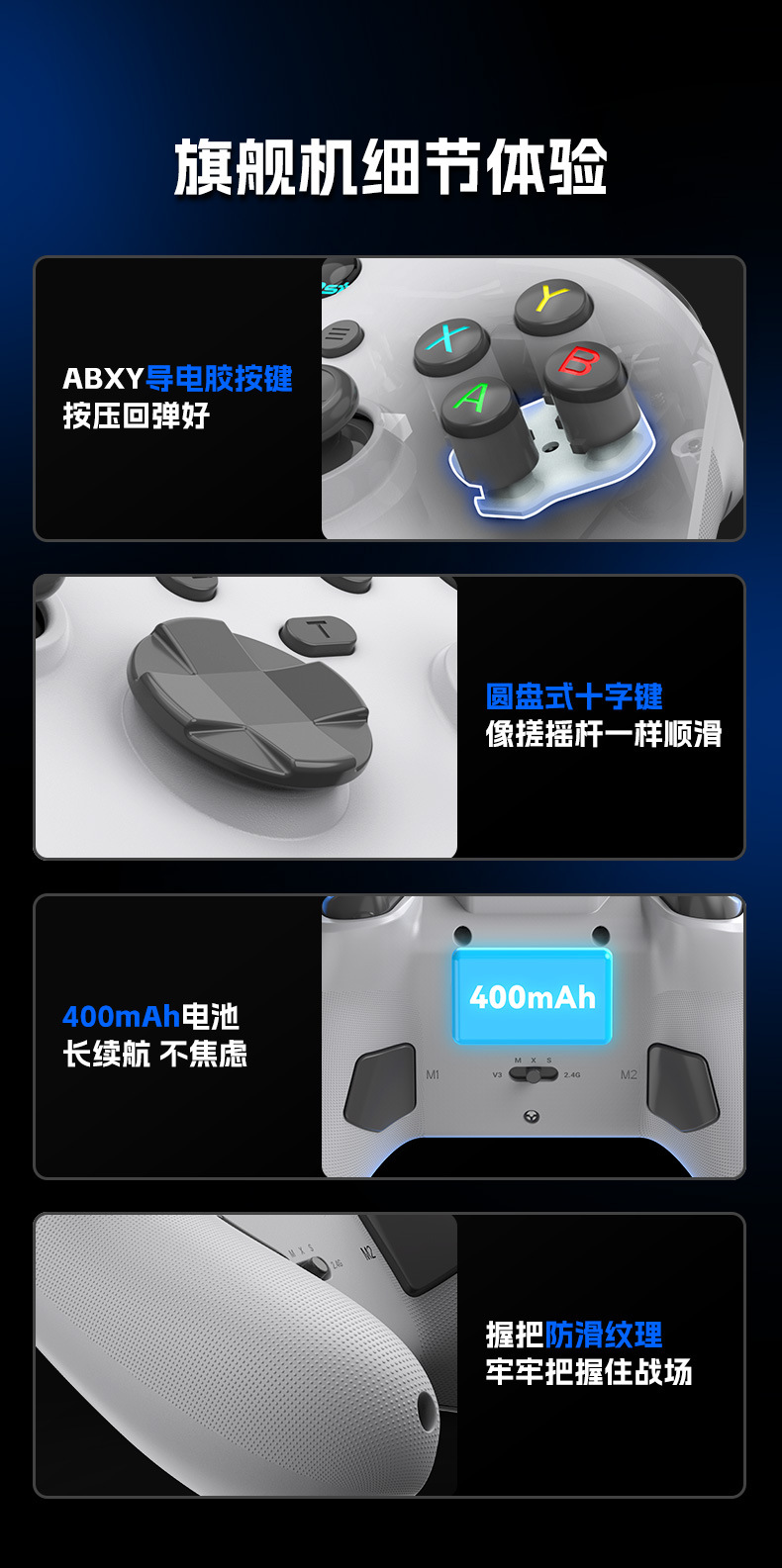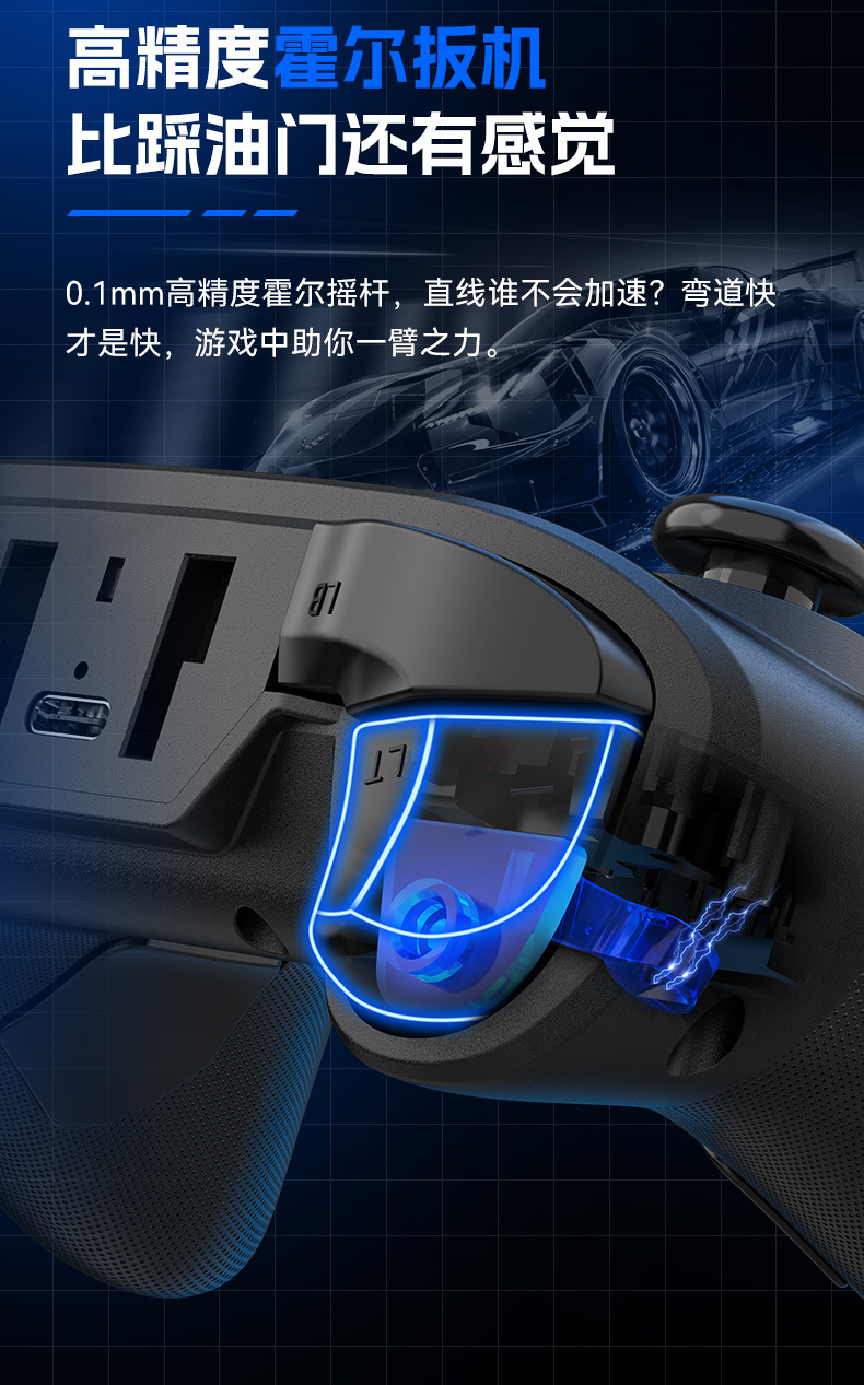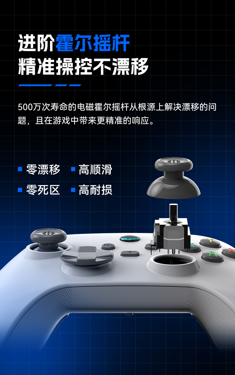 2.霍尔摇杆,精确操控不漂移;高精度霍尔扳机。