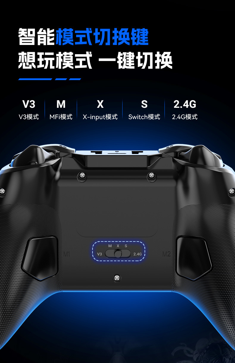 6.智能模式切换键,一键切换五大模式(V3模式、MFI模式、X-input模式、Switch模式、2.4G模式)。
