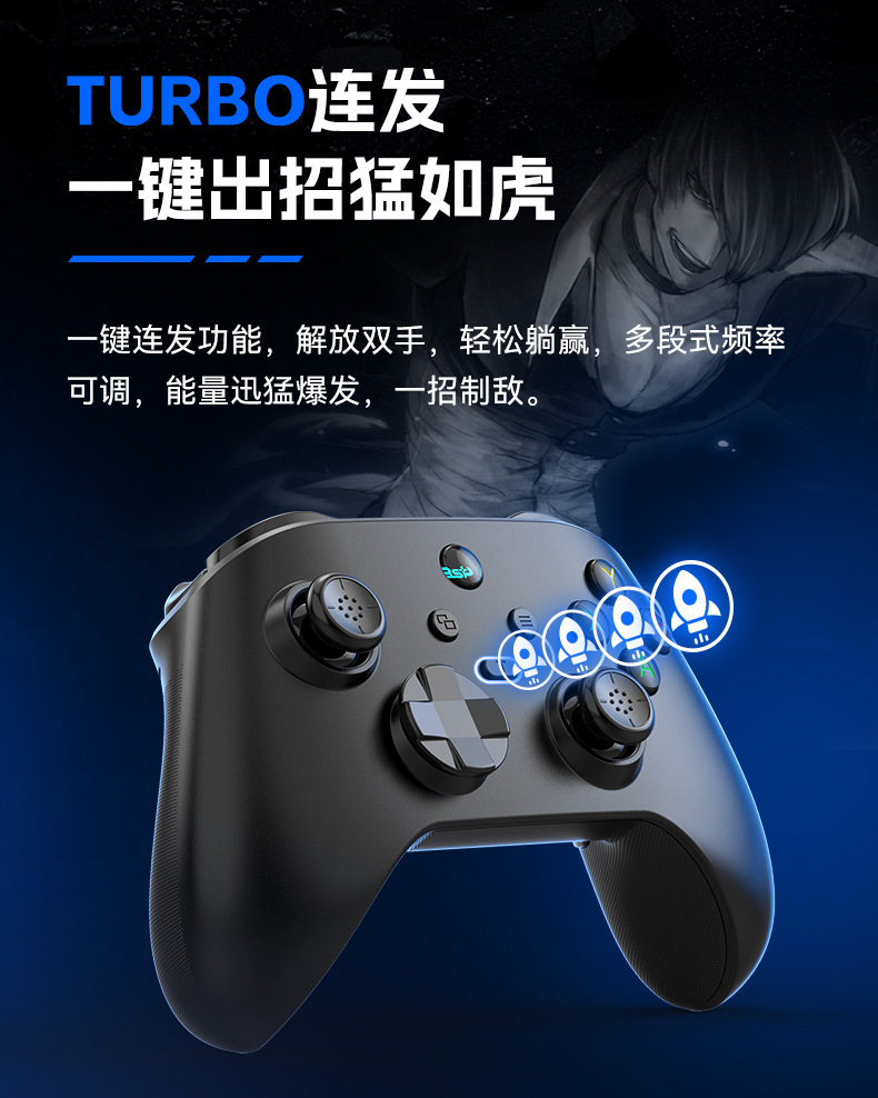 3.六轴体感陀螺仪、带宏编程背键、双震动马达可调节,TURBO一键连发。