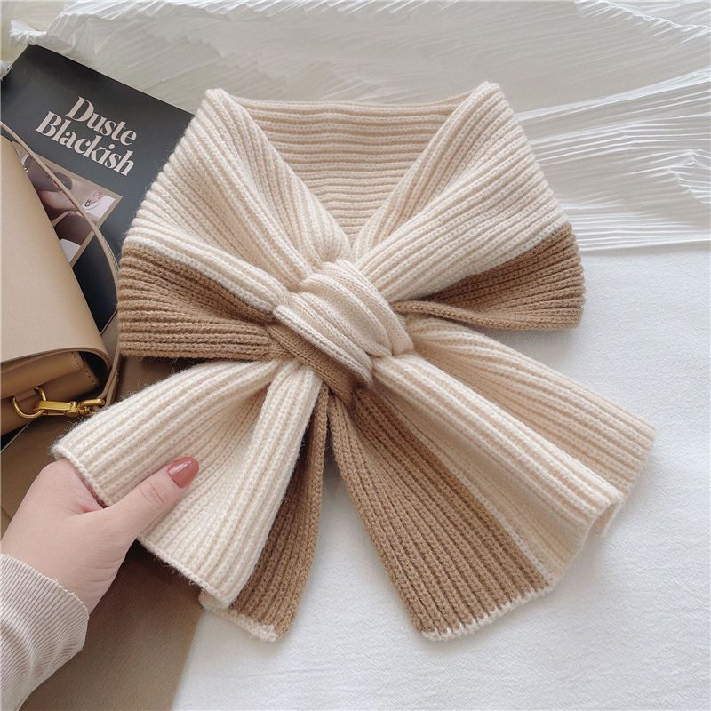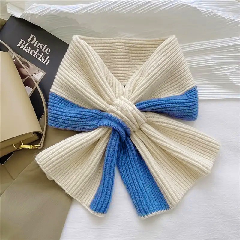 한국식 가을 겨울 따뜻한 여성용 목 보호대, 짧은 더블 컬러 크로스 다용도 소형 스카프, 인터넷 연예인 니트 스카프 트렌드