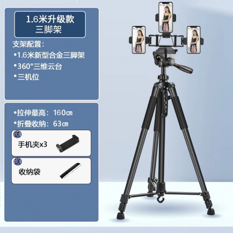 • 1.6m 카메라 및 휴대폰용 범용 삼각대 - 삼각대 + 휴대폰 클립 + 보관 가방 + 카메라 위치 3개