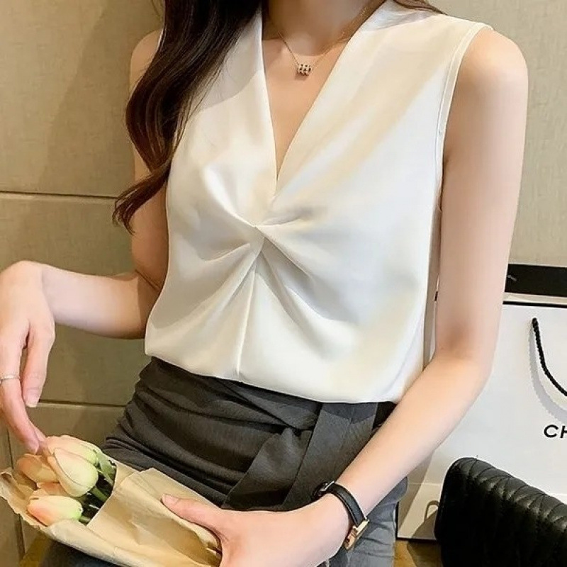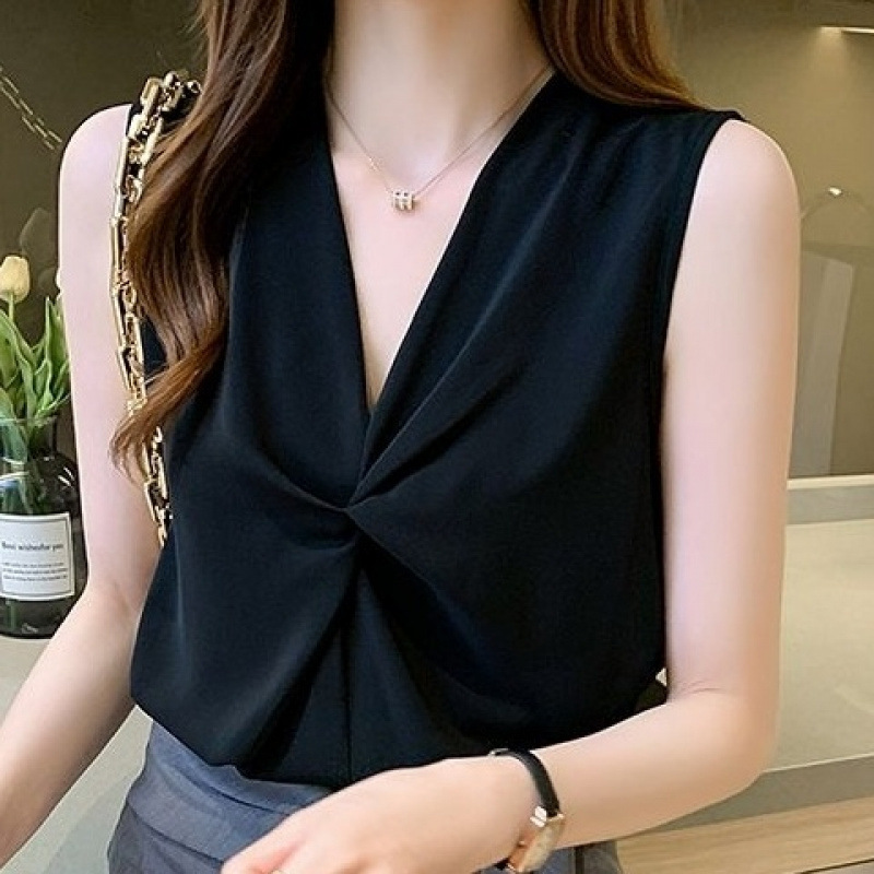 2025 봄 여름 여성용 민소매 쉬폰 탑 새로운 크로스 브이넥 루즈하고 세련된 배 커버 한국식 쉬폰 셔츠 트렌디 여성스토어 가기