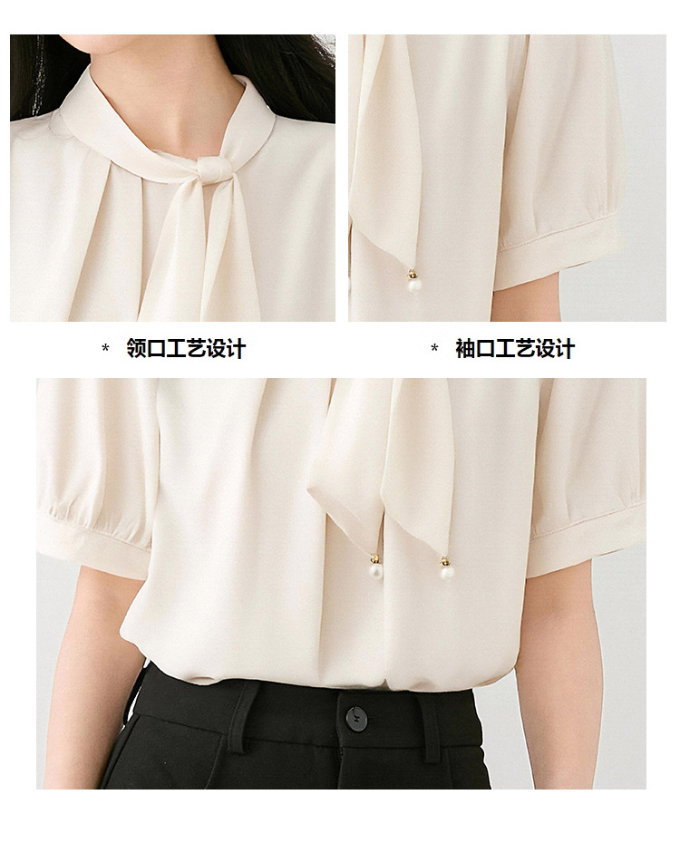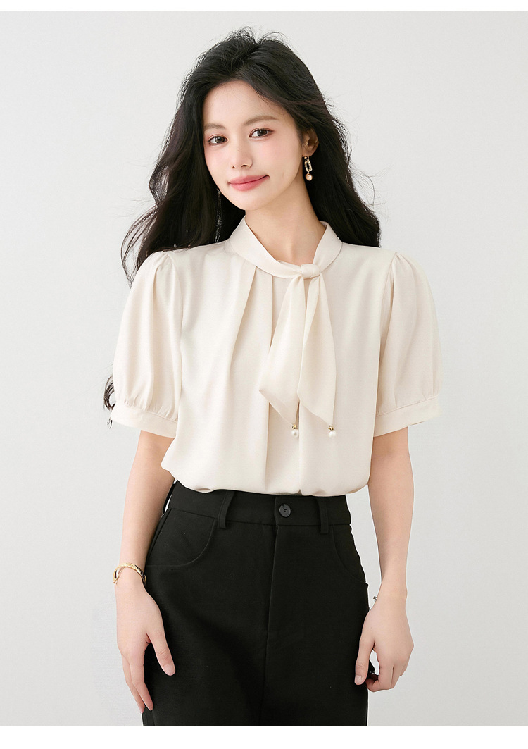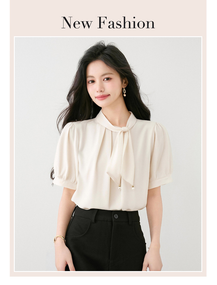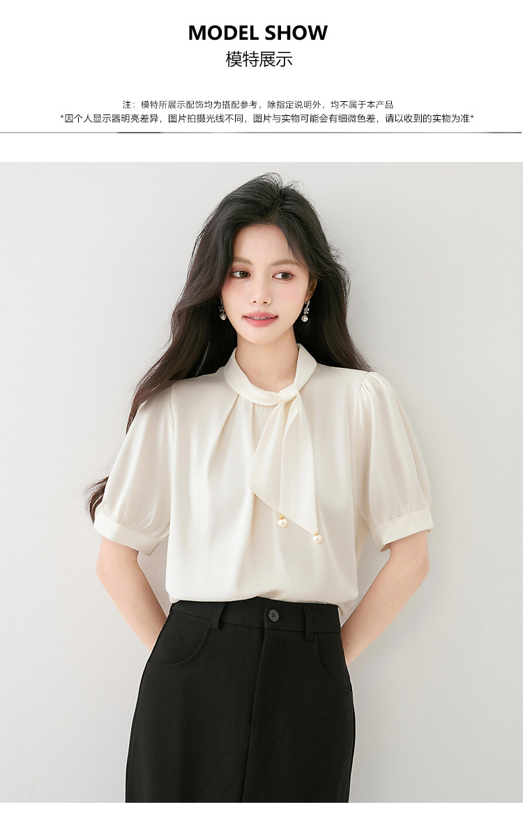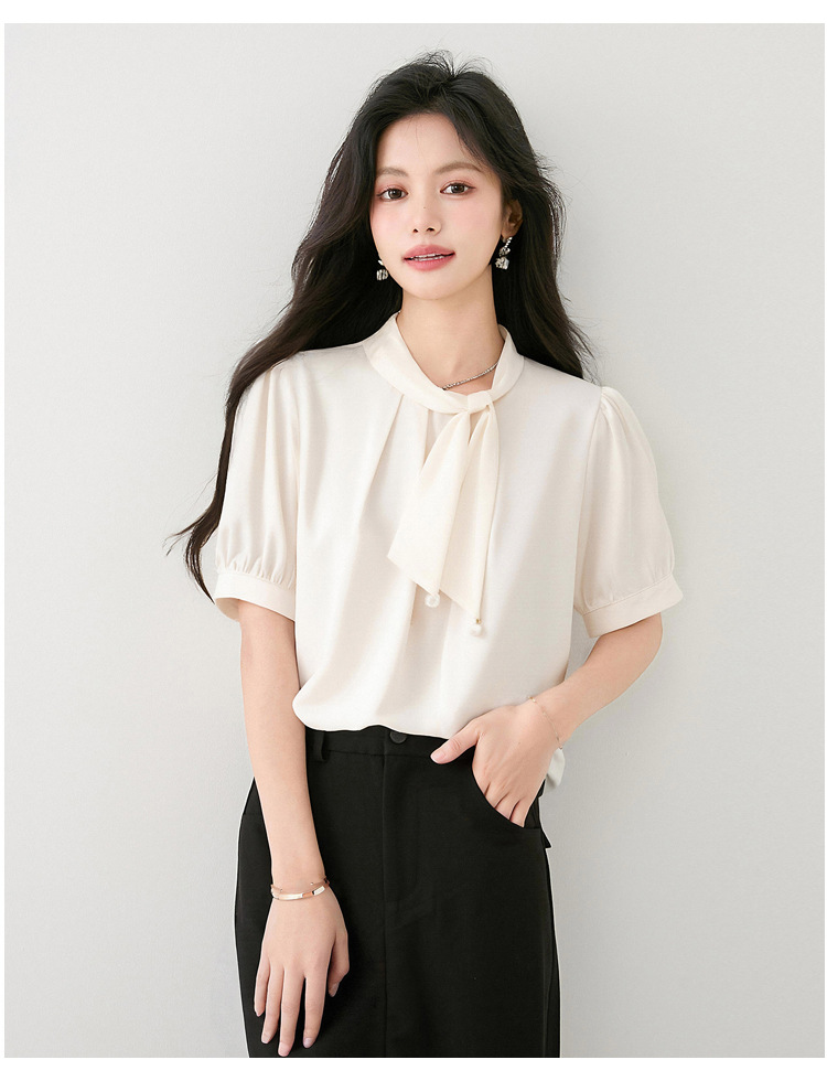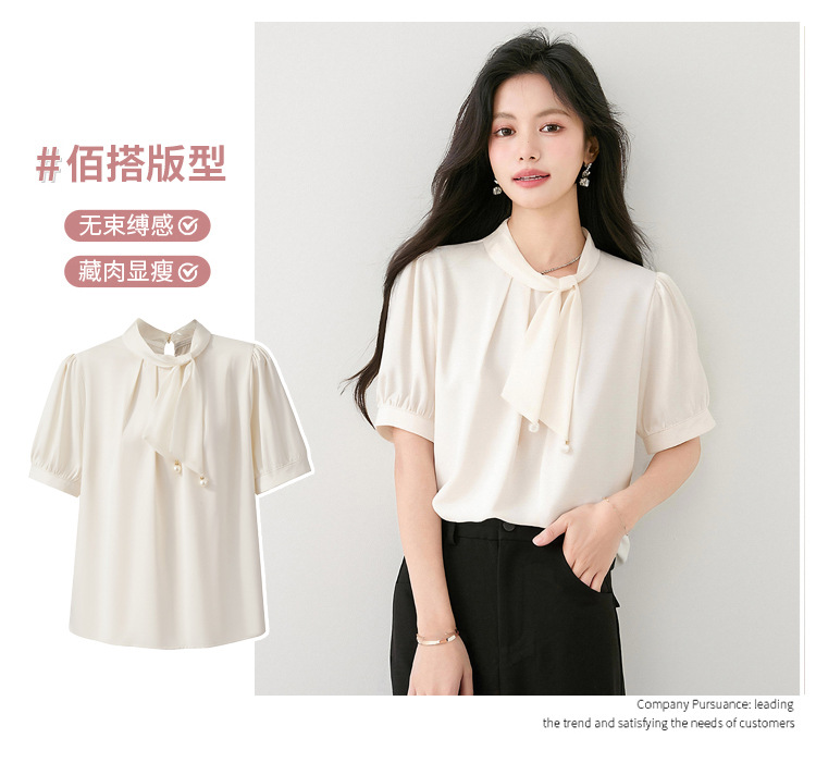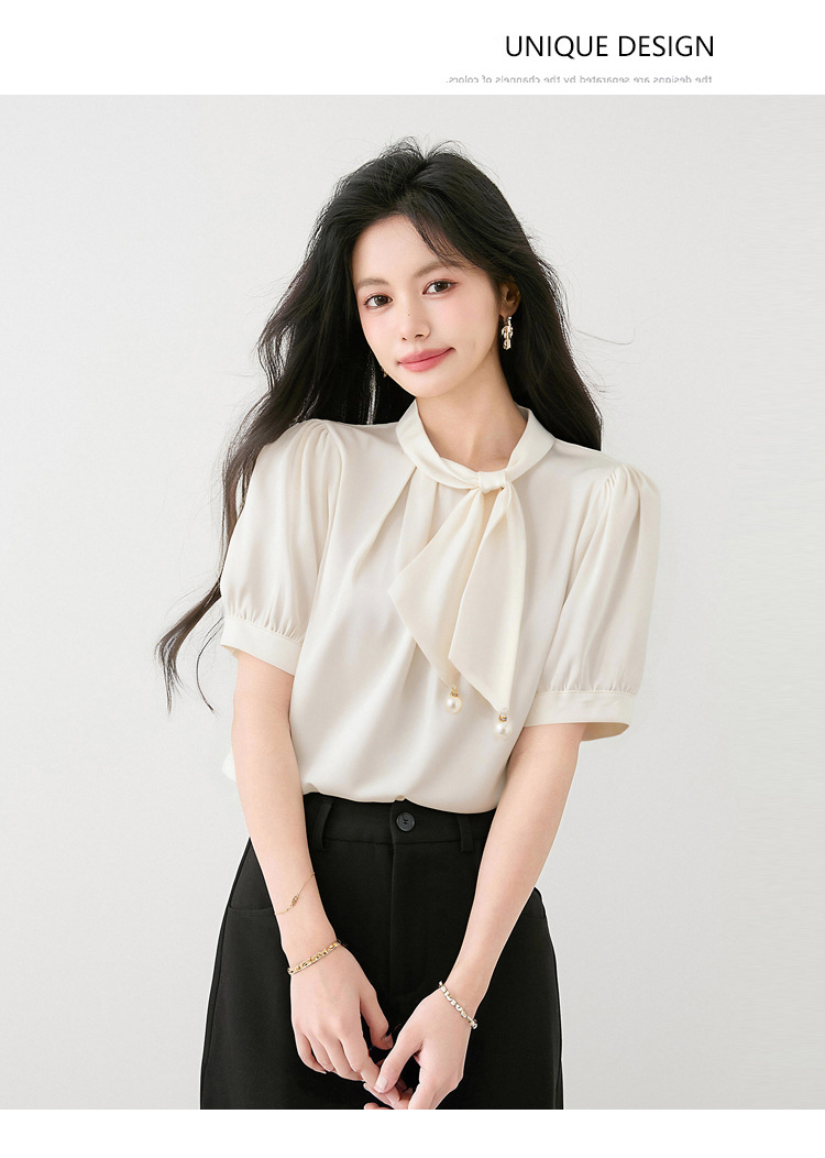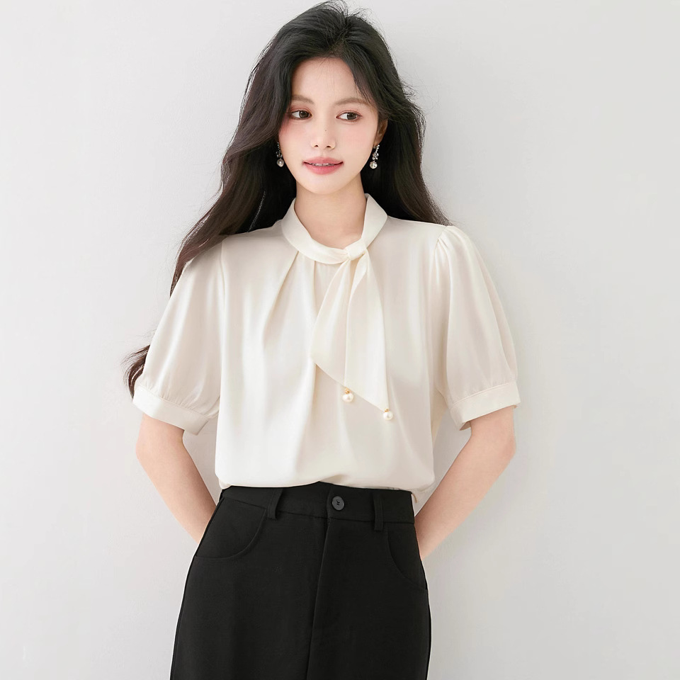 2025 새로운 여름 스타일 프렌치 보우 반팔 아세테이트 새틴 셔츠 여성스러운 루즈 풀오버 쉬폰 셔츠
