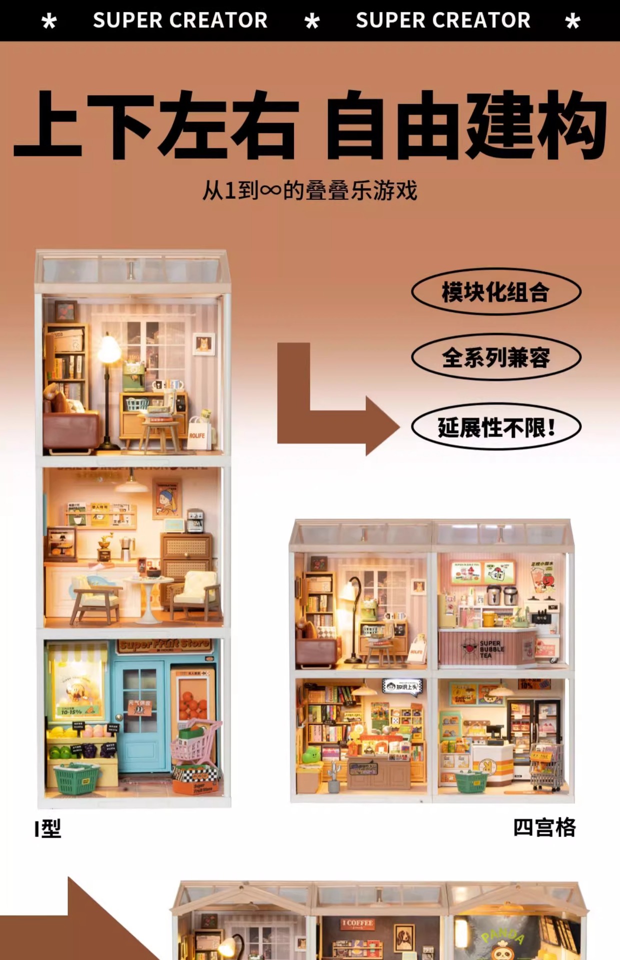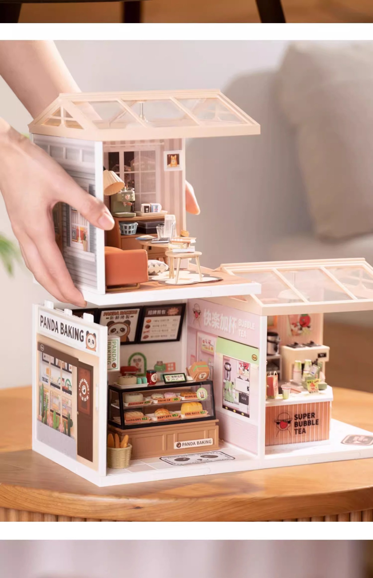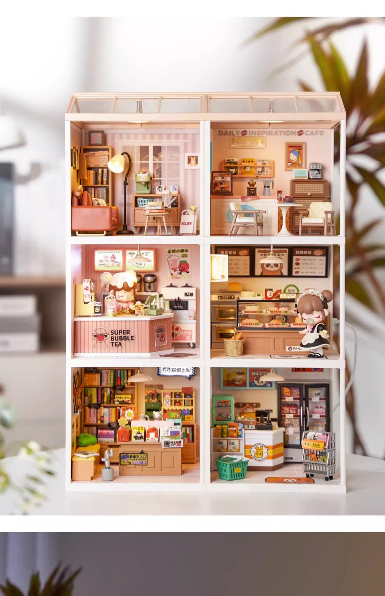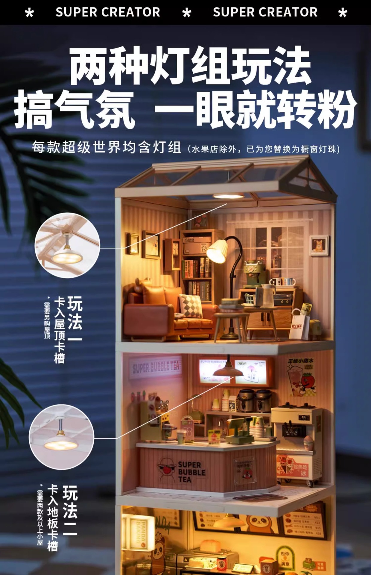 정품 Ruolai 슈퍼 월드 diy 수제 캐빈 밀크 티 샵 미니어처 조립 빌딩 블록 어린이 날 선물 장난감스토어 가기