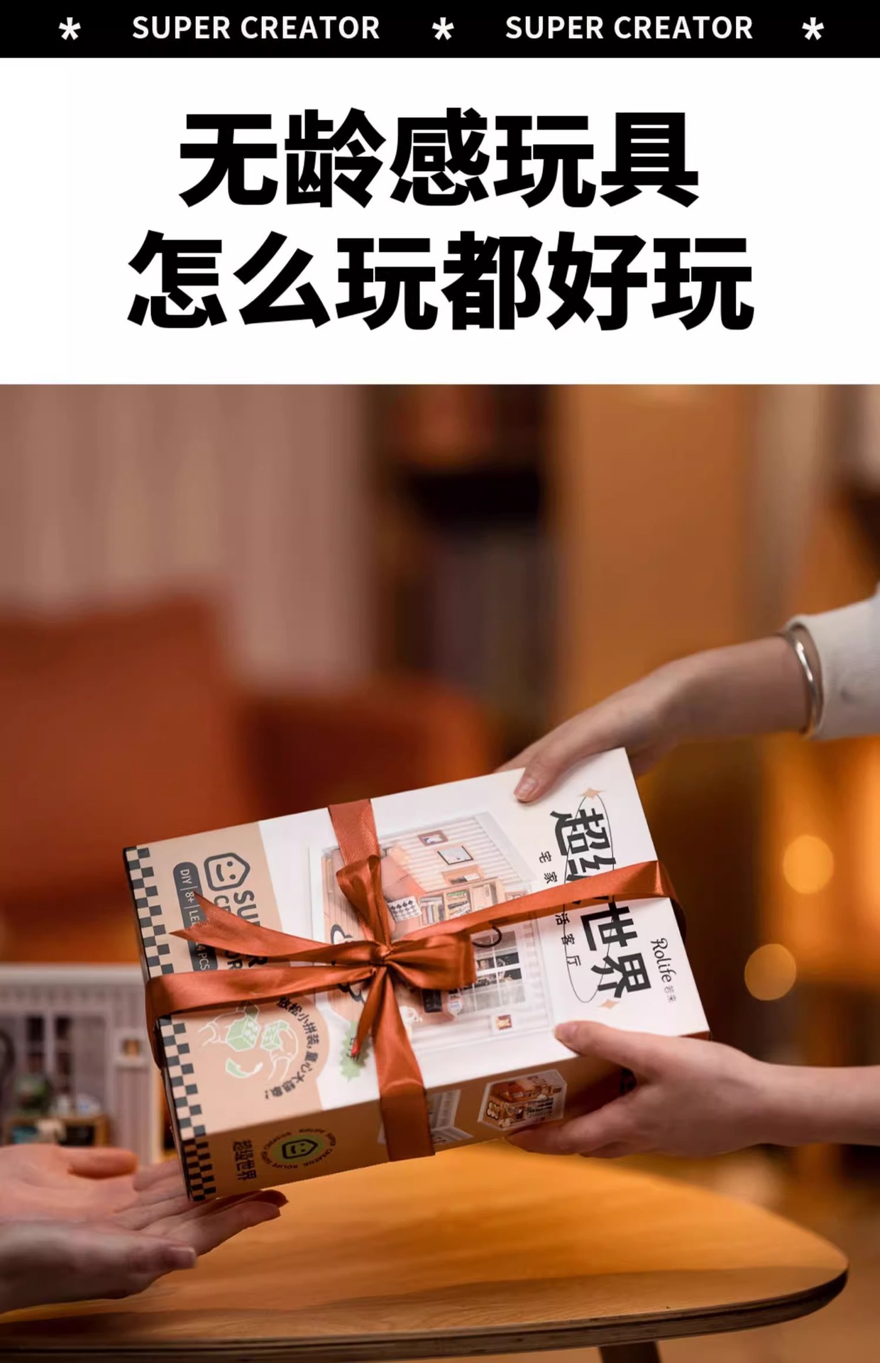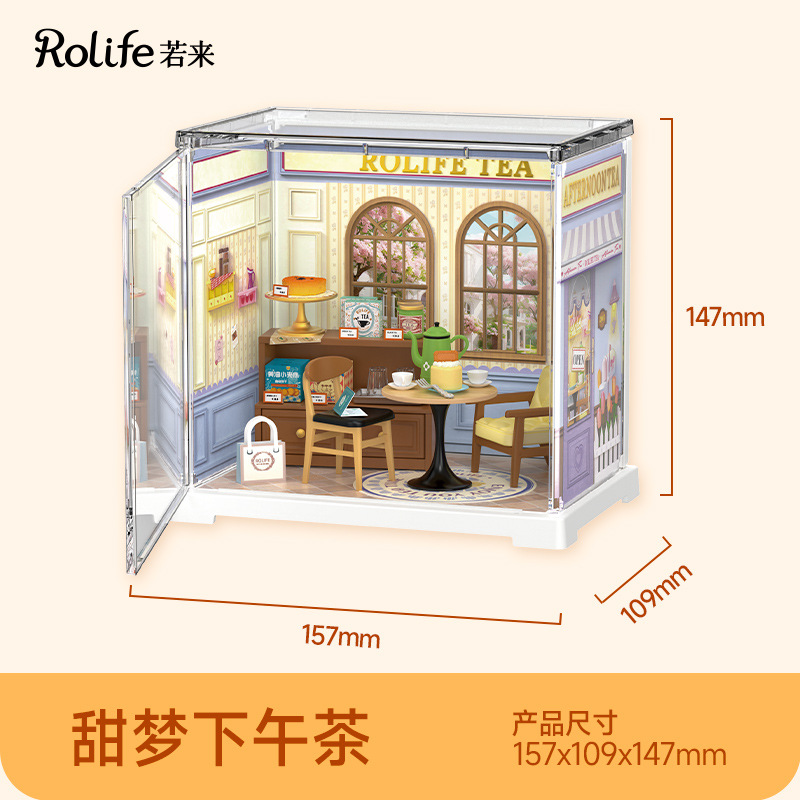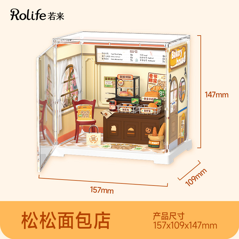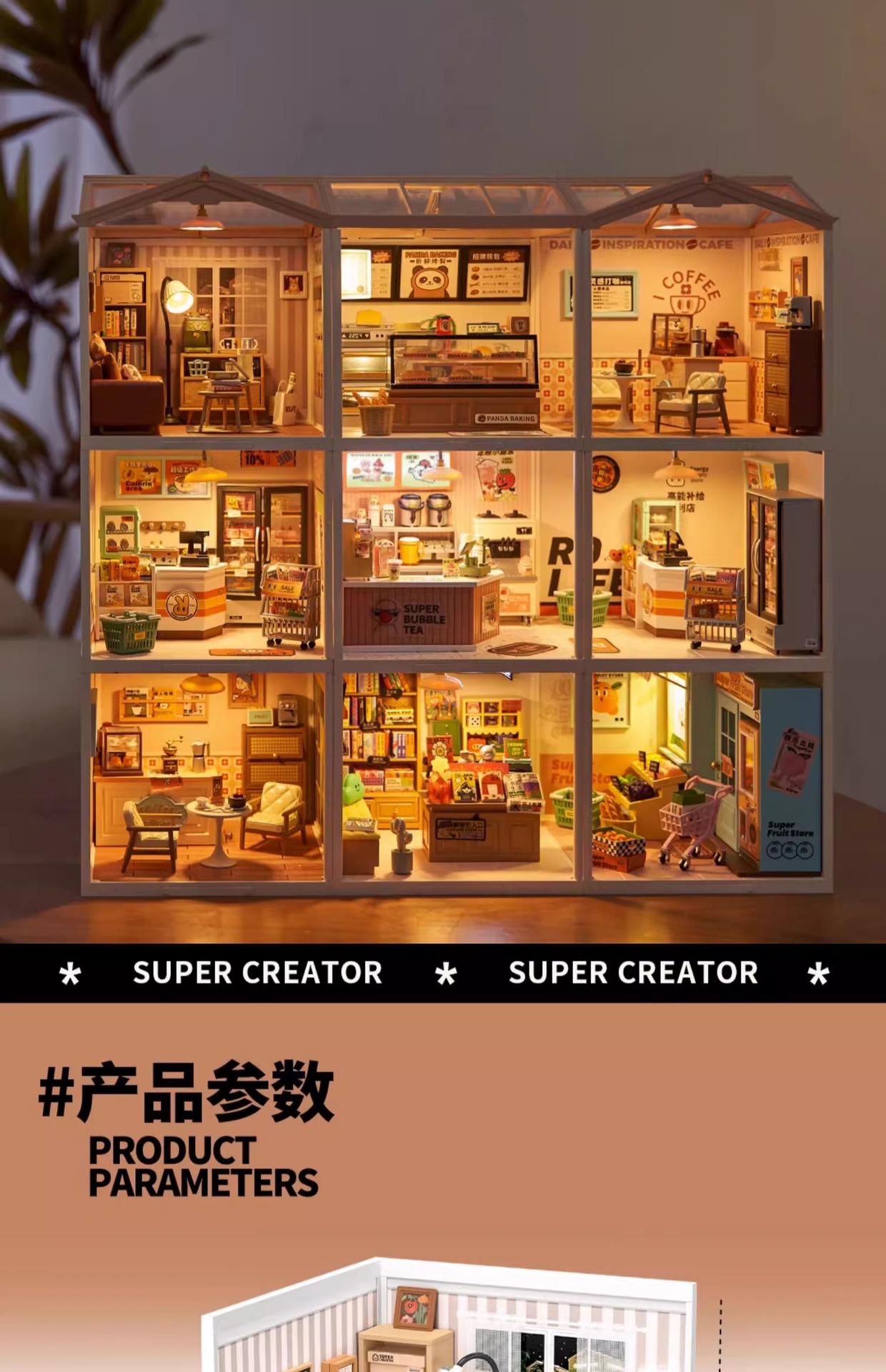 정품 Ruolai 슈퍼 월드 diy 수제 캐빈 밀크 티 샵 미니어처 조립 빌딩 블록 어린이 날 선물 장난감스토어 가기