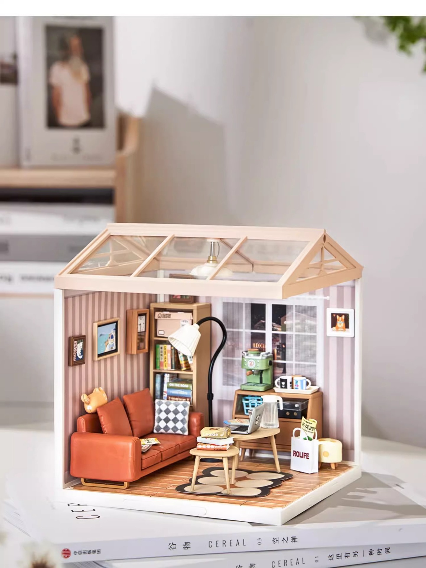 정품 Ruolai 슈퍼 월드 diy 수제 캐빈 밀크 티 샵 미니어처 조립 빌딩 블록 어린이 날 선물 장난감