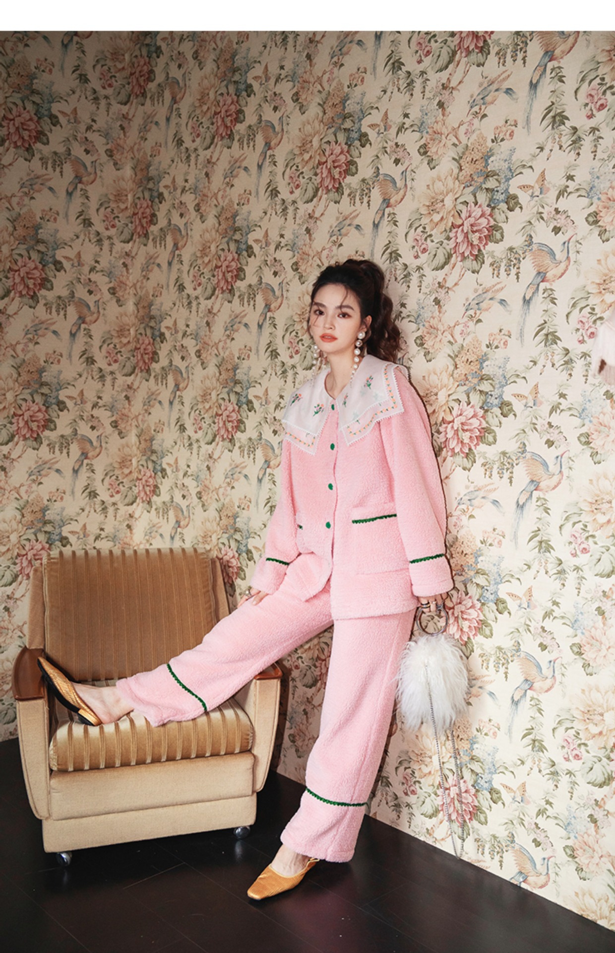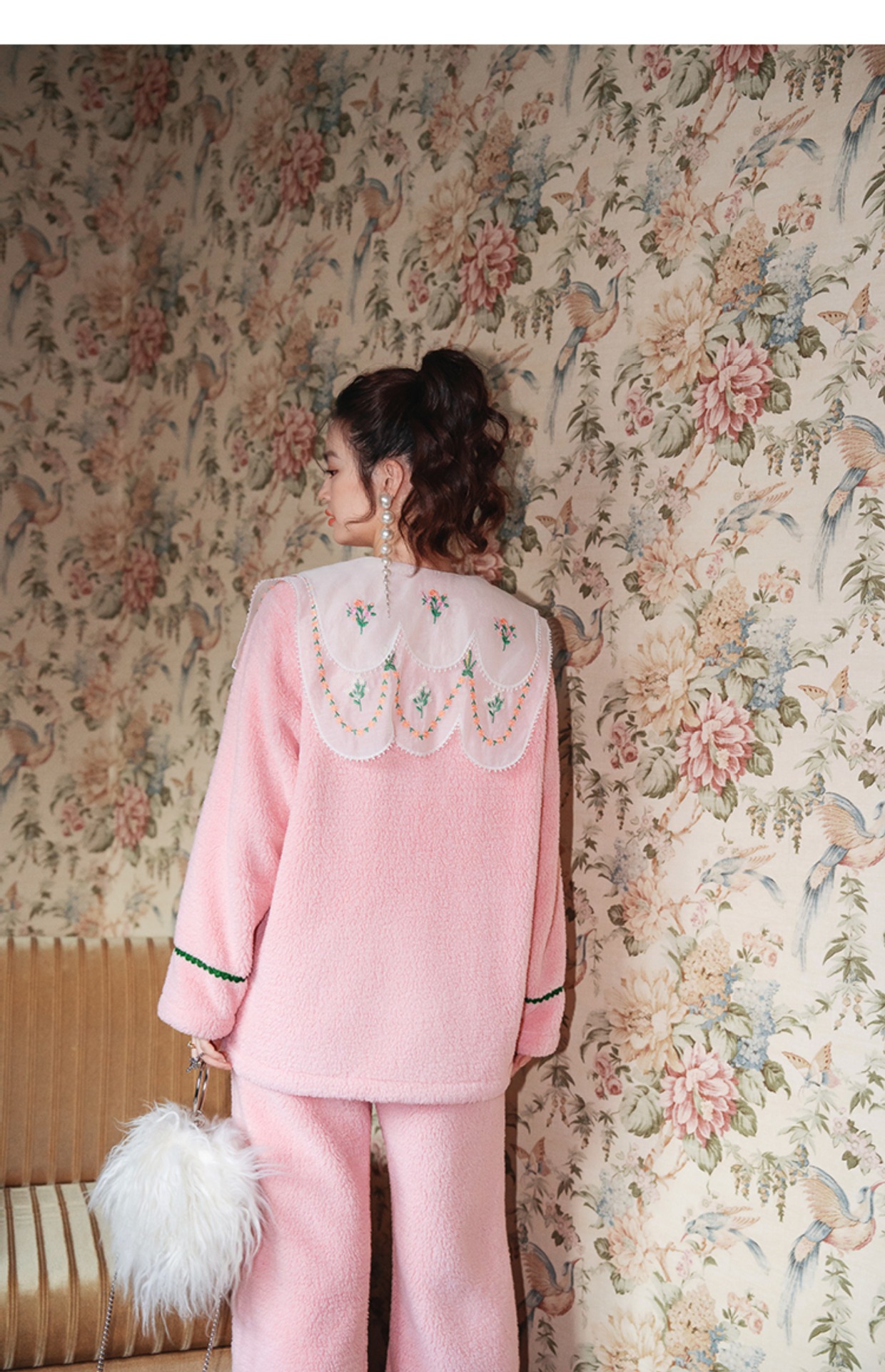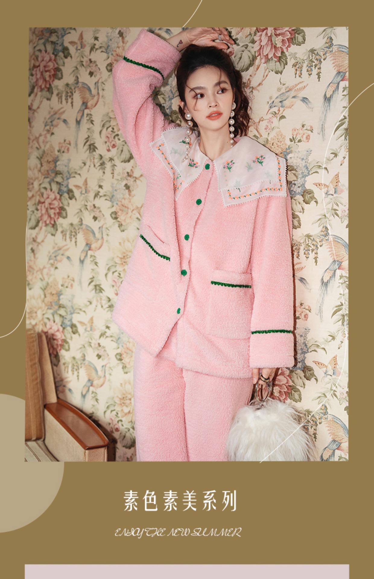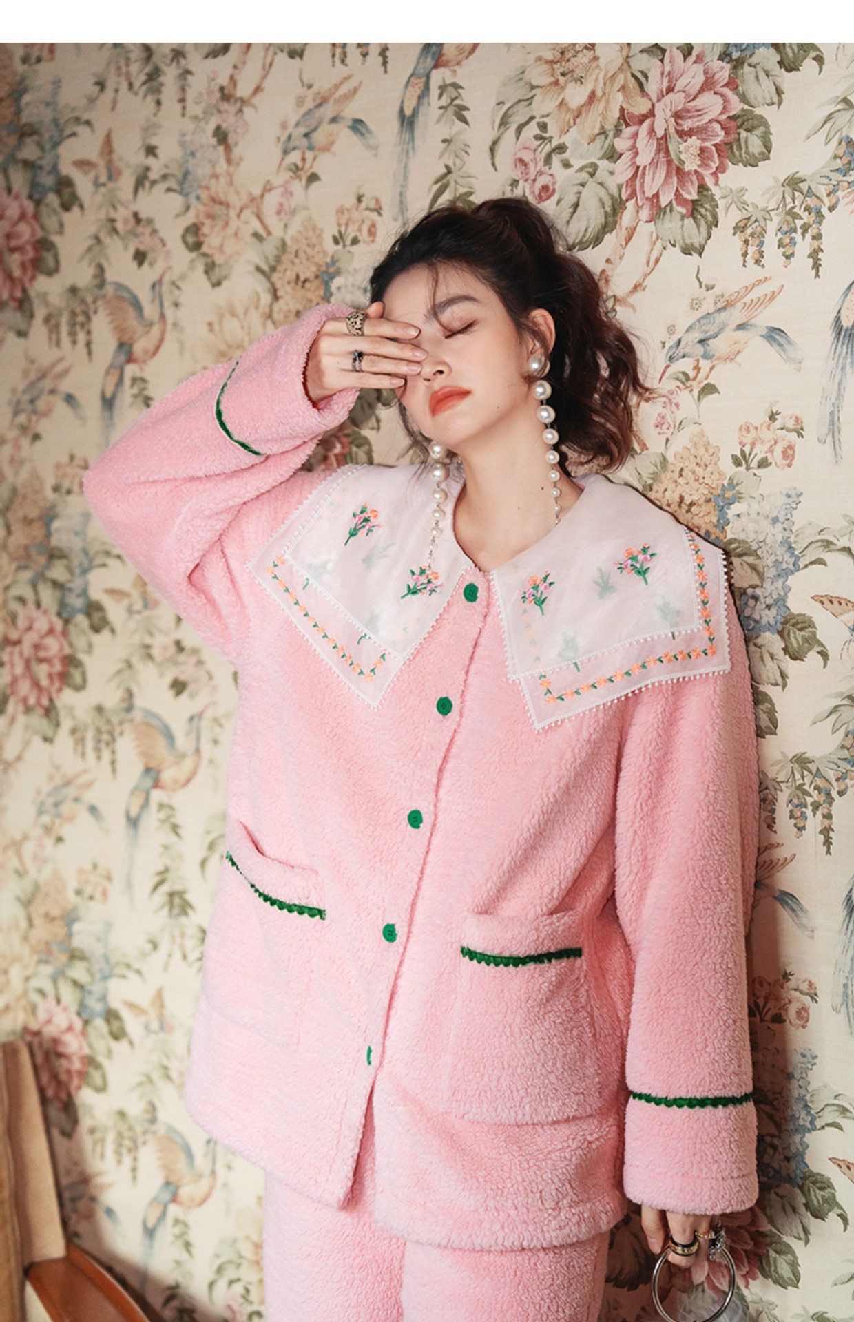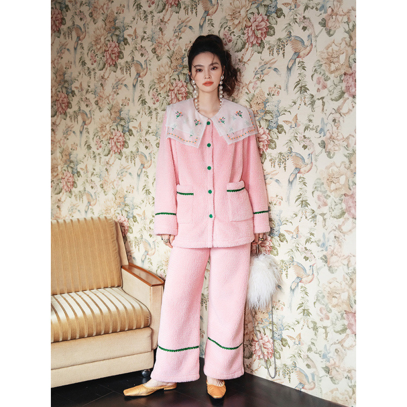 Yuanqi 소녀 핑크 클라우드 새로운 중국 스타일 잠옷 세트 레이스 자수 옷깃은 집 밖에서 착용 가능