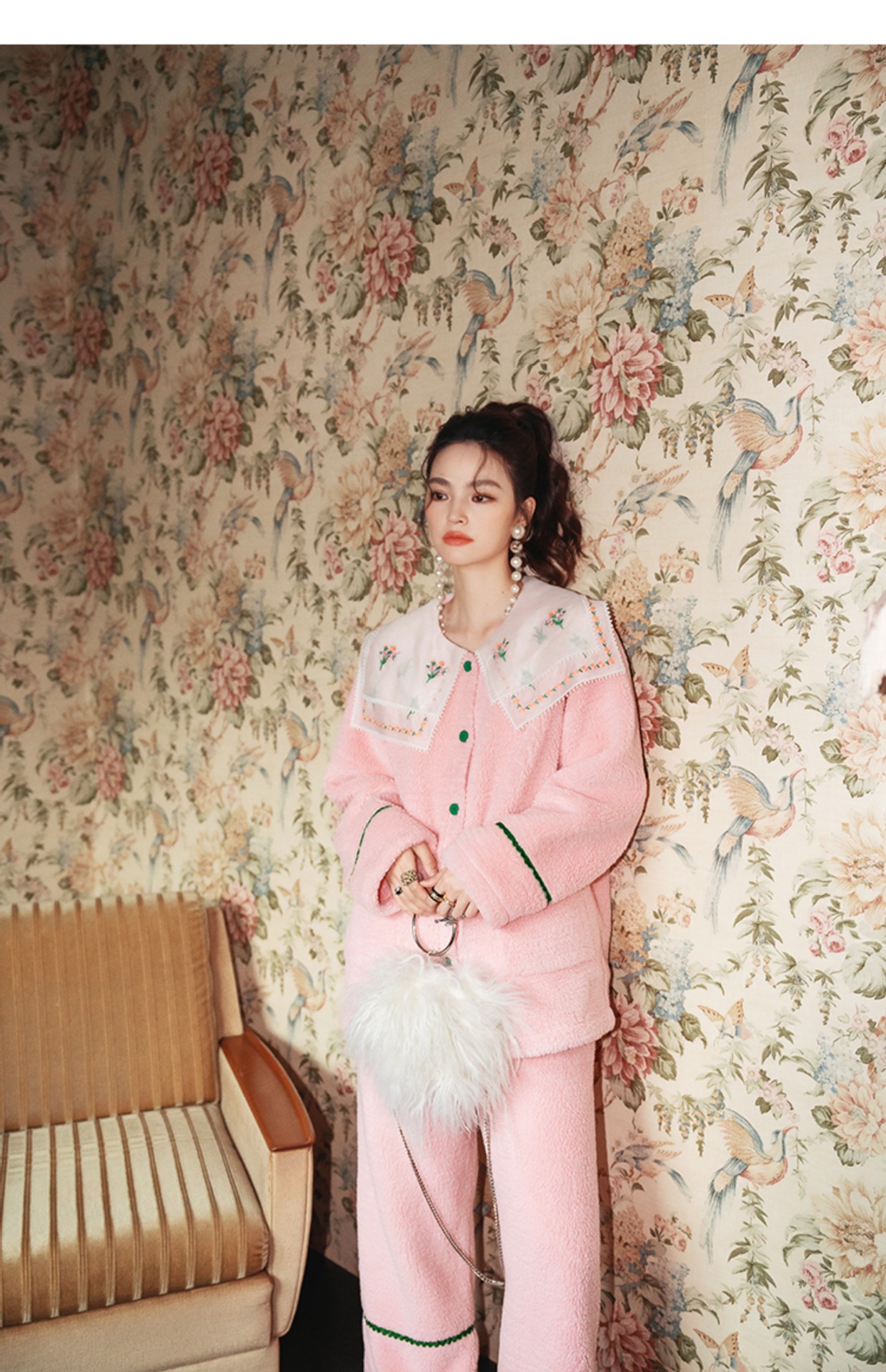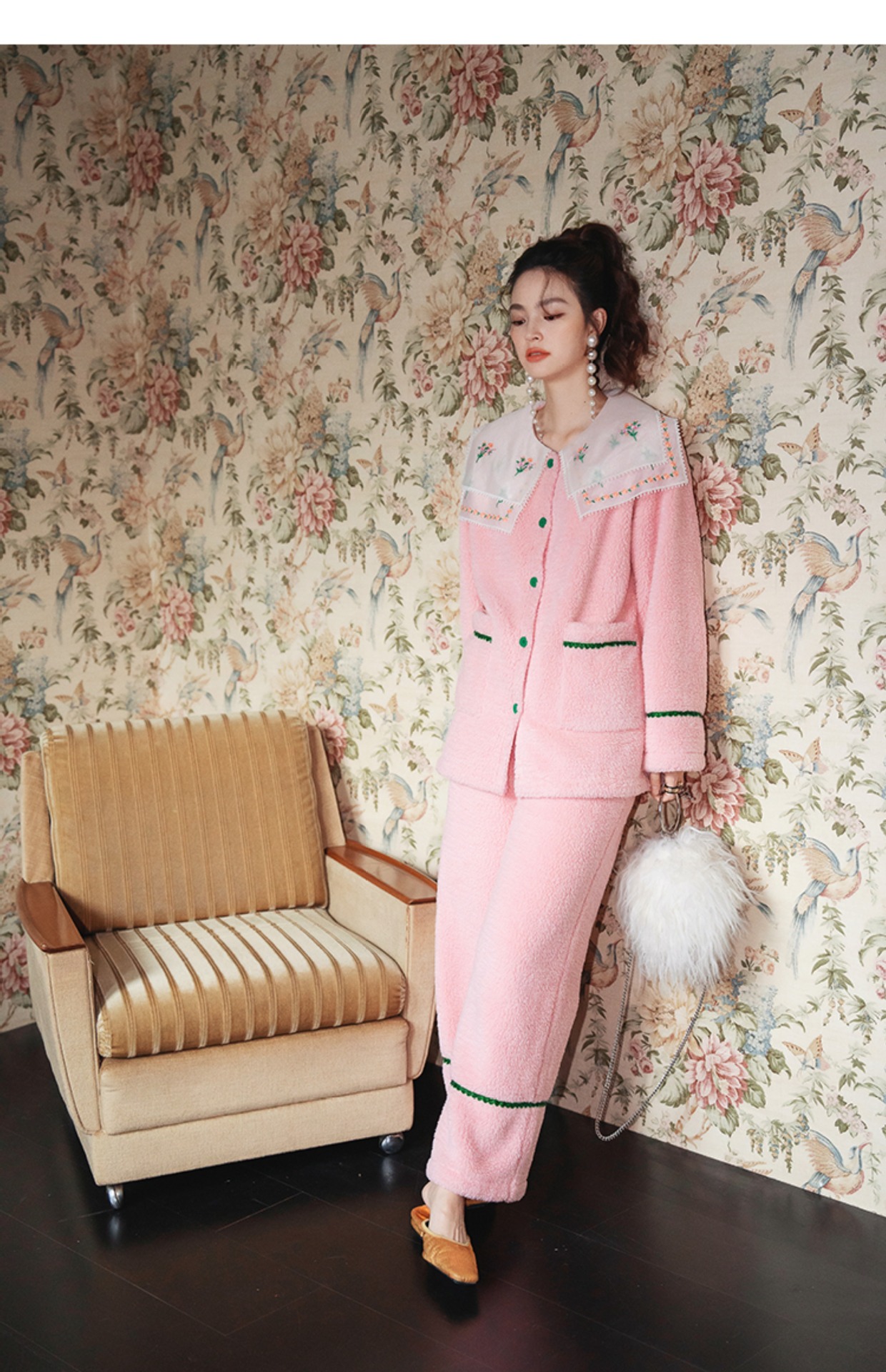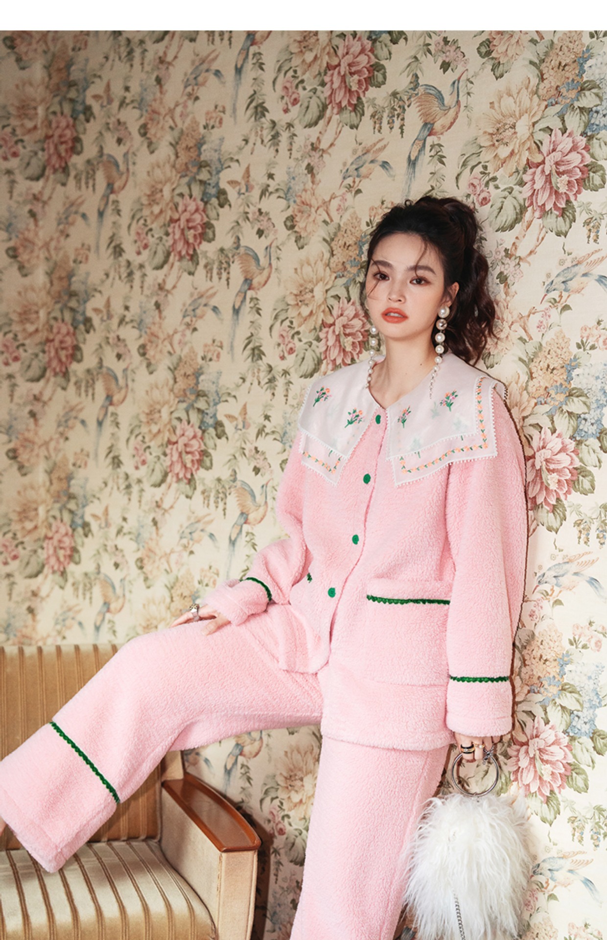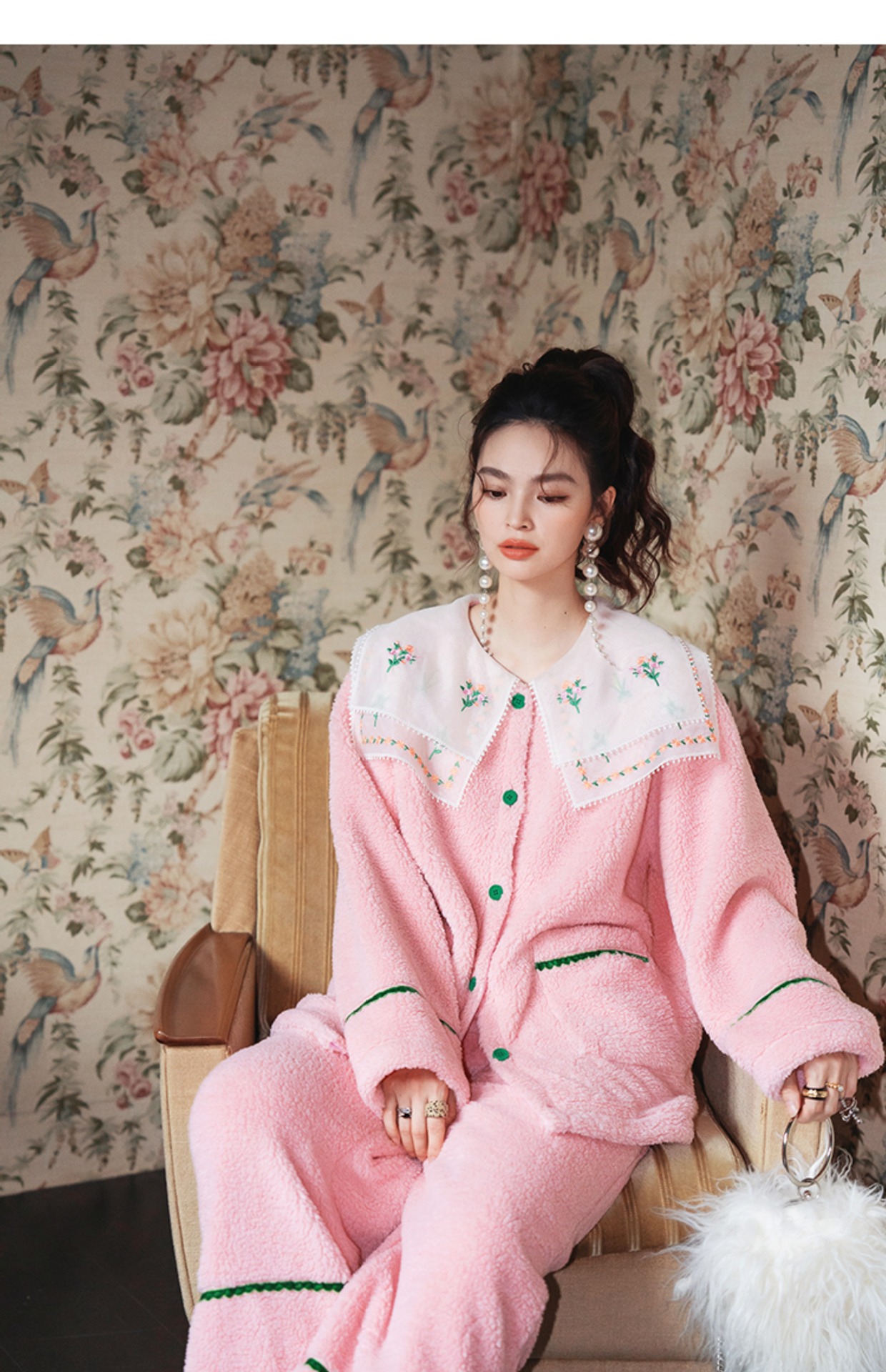 Yuanqi 소녀 핑크 클라우드 새로운 중국 스타일 잠옷 세트 레이스 자수 옷깃은 집 밖에서 착용 가능