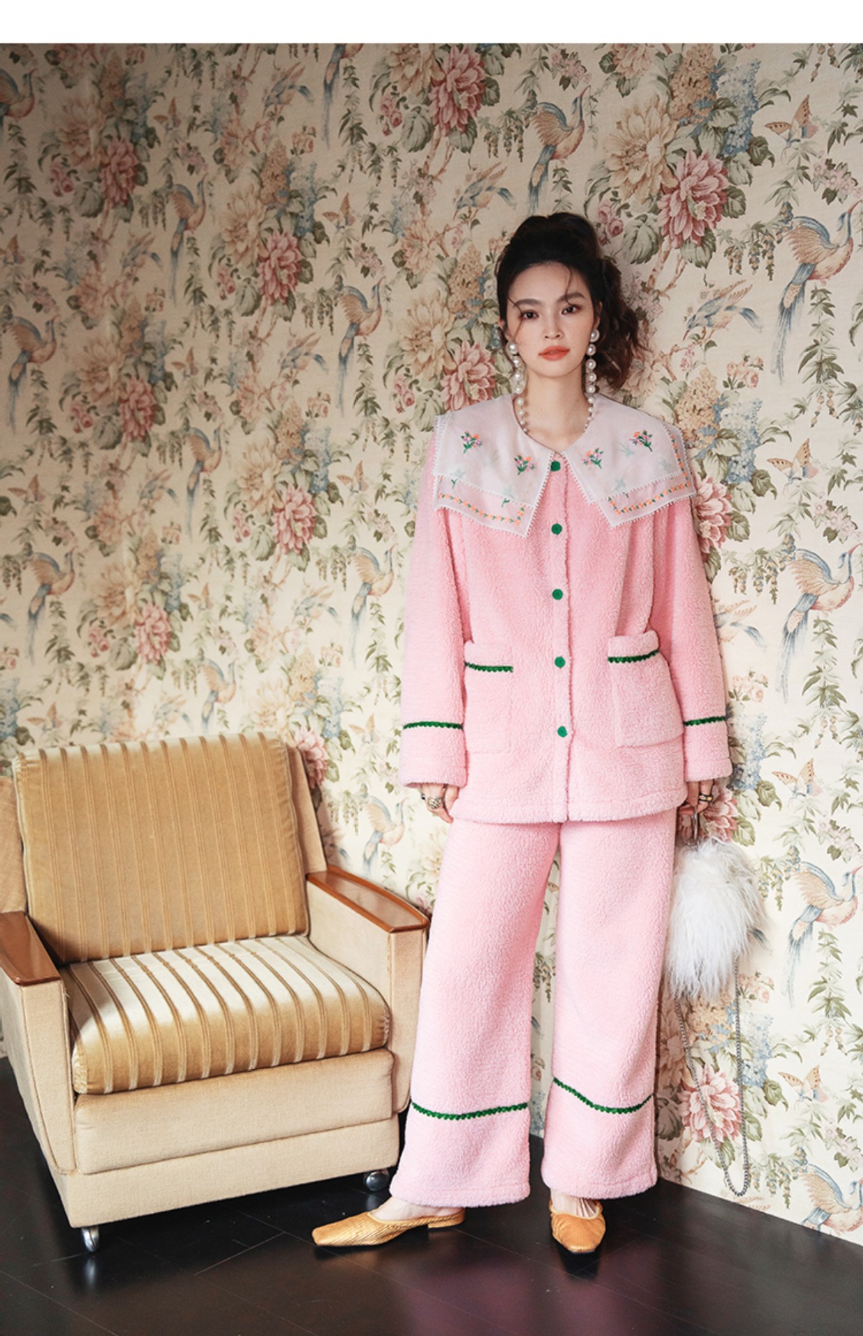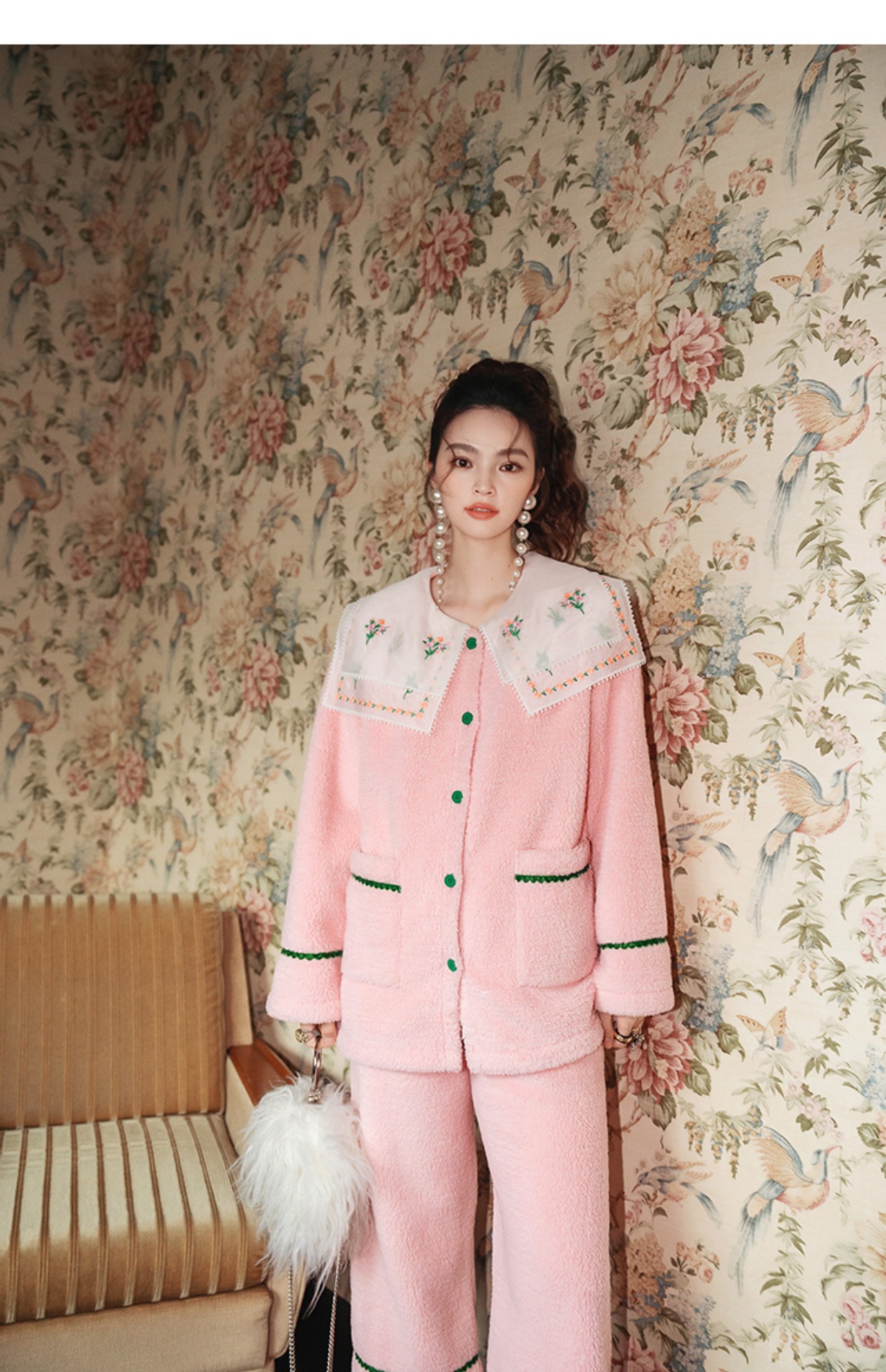 Yuanqi 소녀 핑크 클라우드 새로운 중국 스타일 잠옷 세트 레이스 자수 옷깃은 집 밖에서 착용 가능스토어 가기