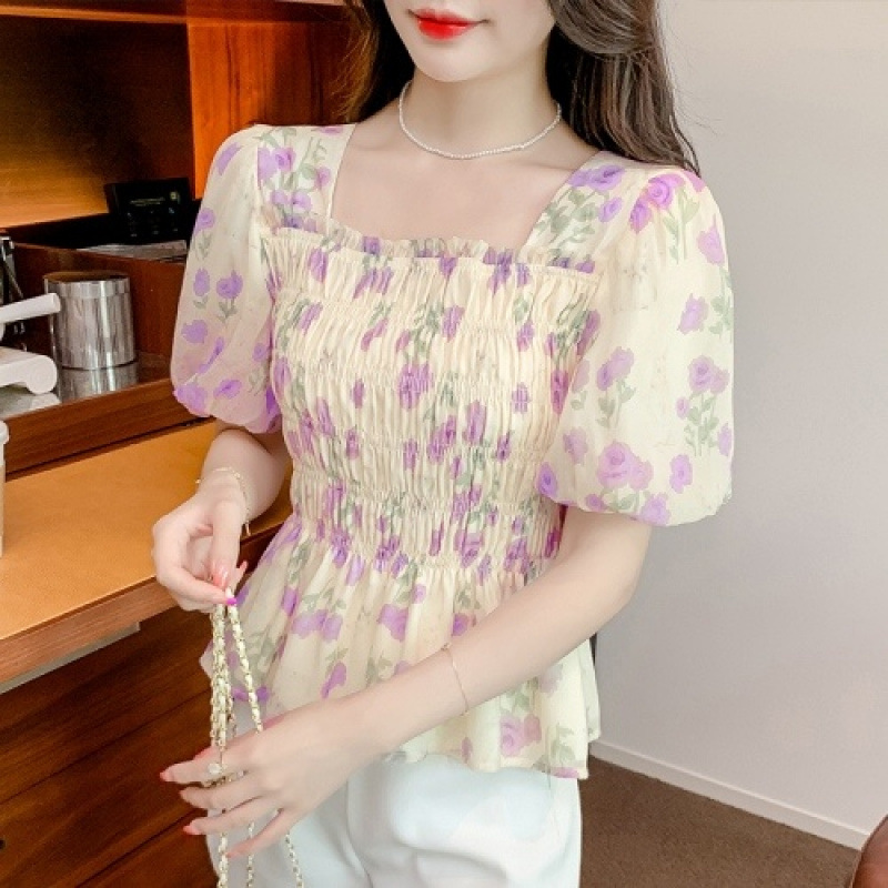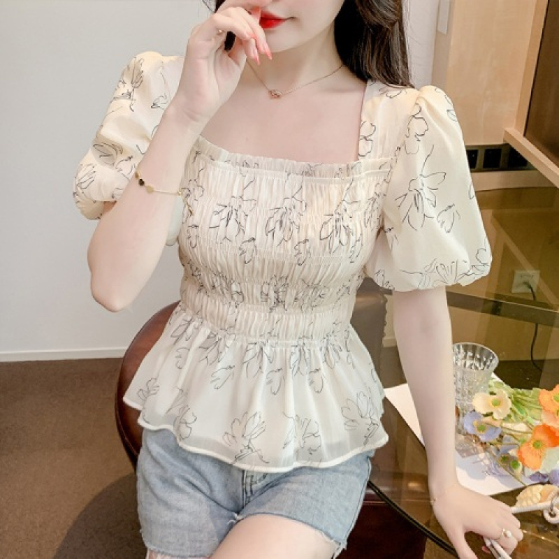 짧은 스타일 + 프렌치 하이엔드 퍼프 슬리브 시크 탑 디자인 틈새 허리 스타일 꽃무늬 쉬폰 셔츠 스퀘어 넥스토어 가기