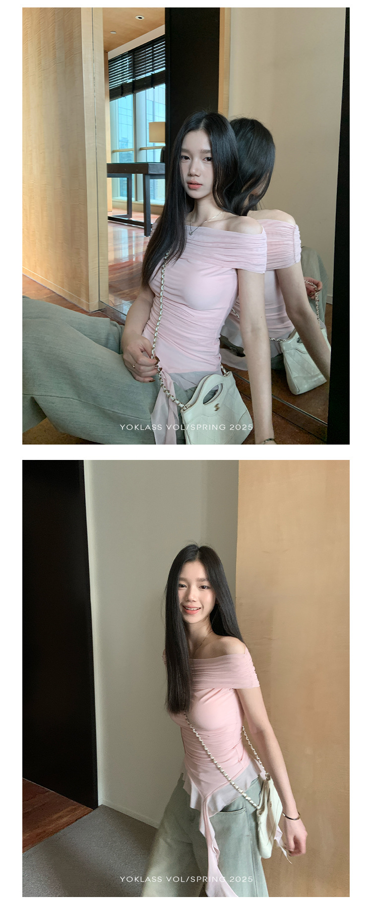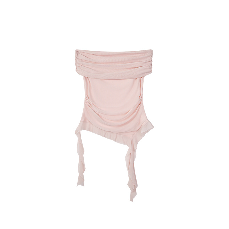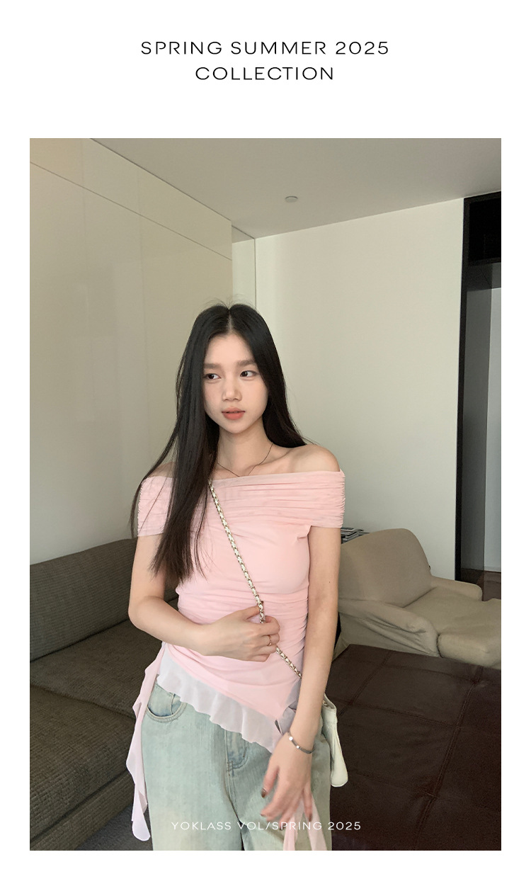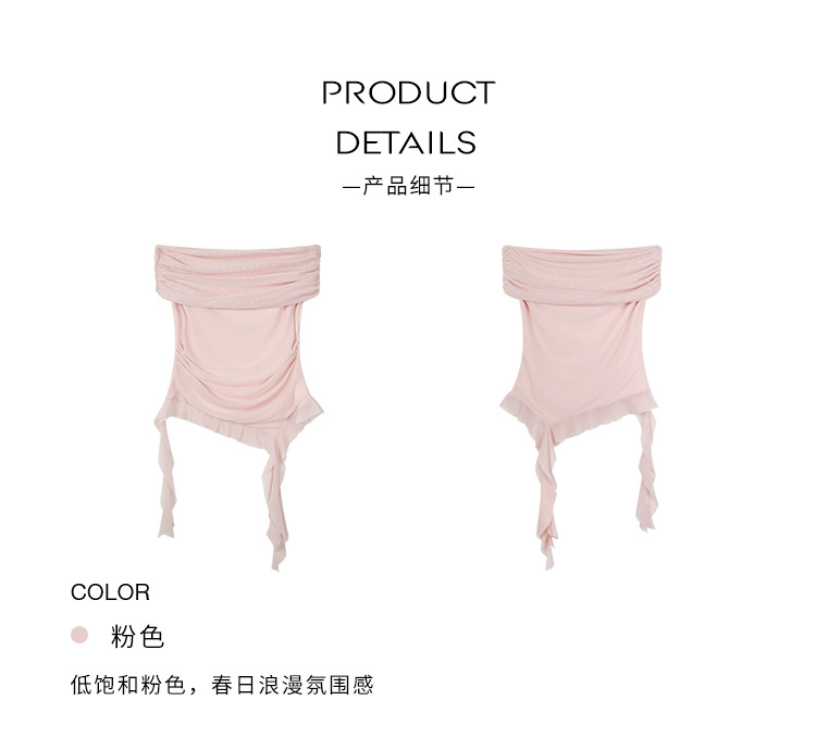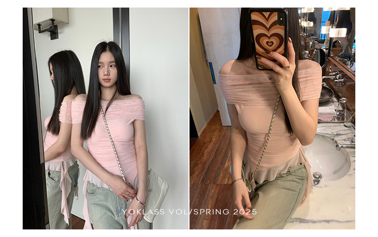 핑크색 원라인 칼라 쉬폰 셔츠 봄 신상 달콤한 디자인 감각의 우아한 러플 탑