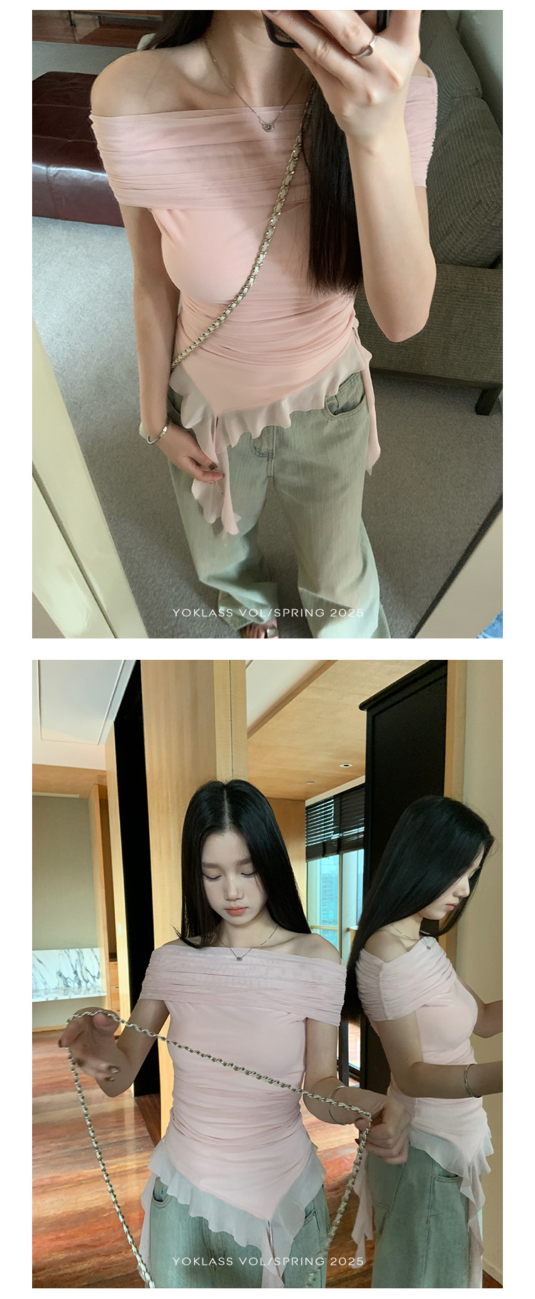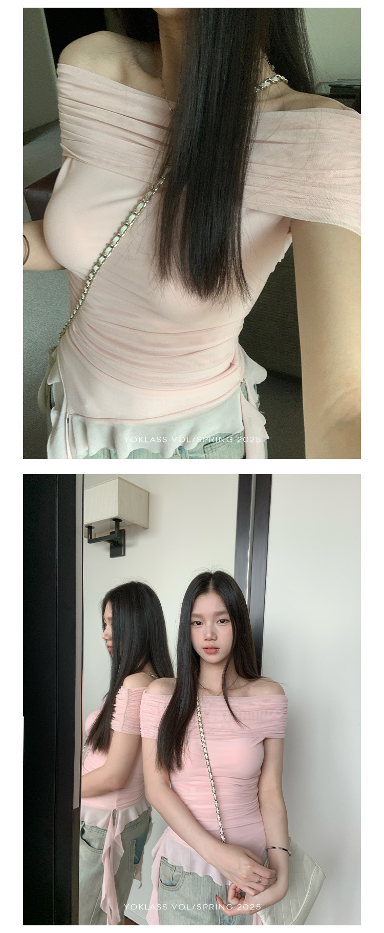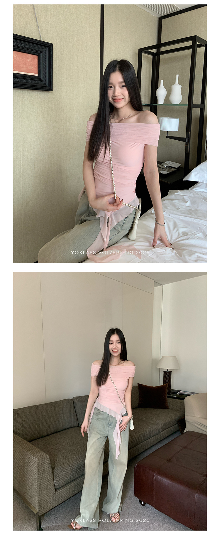 핑크색 원라인 칼라 쉬폰 셔츠 봄 신상 달콤한 디자인 감각의 우아한 러플 탑