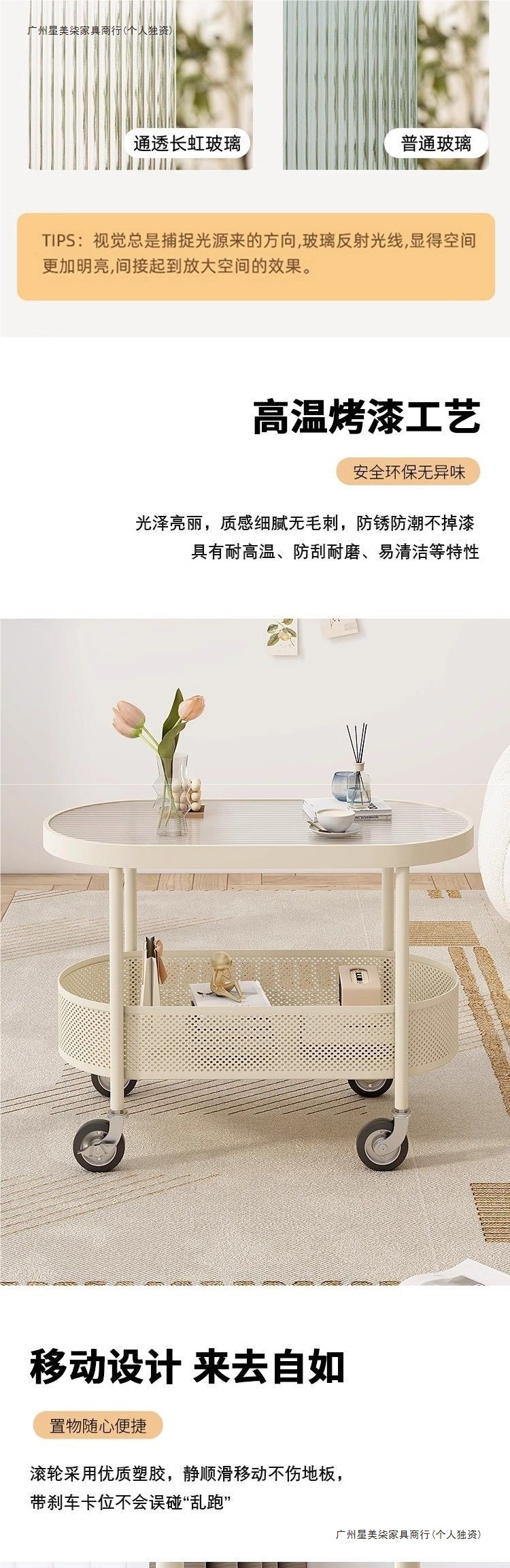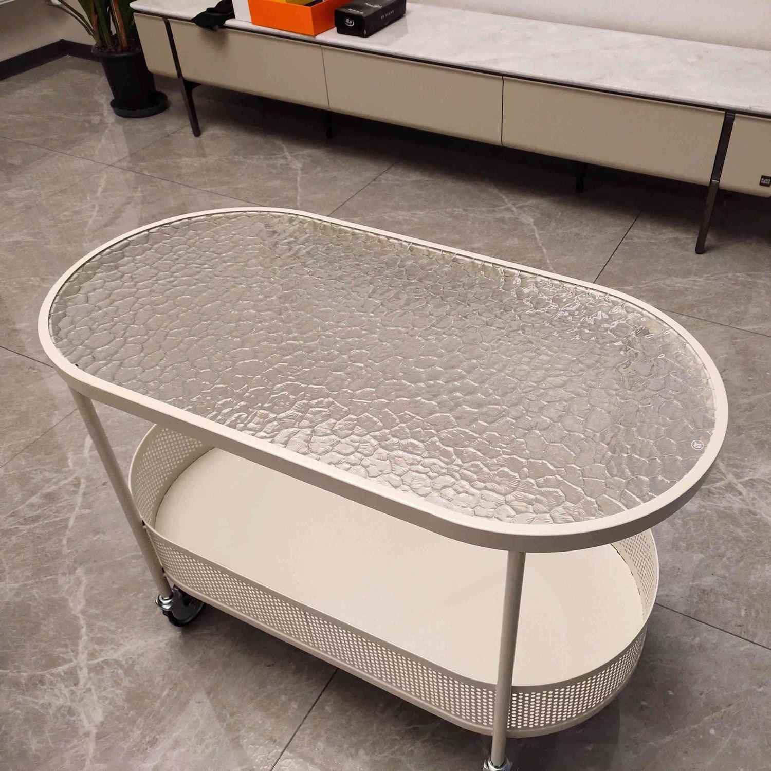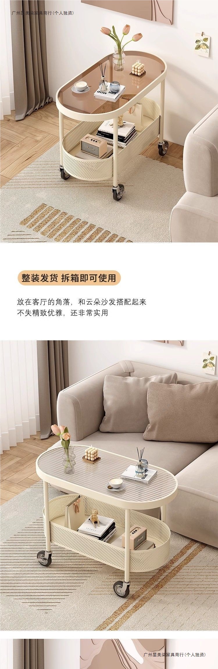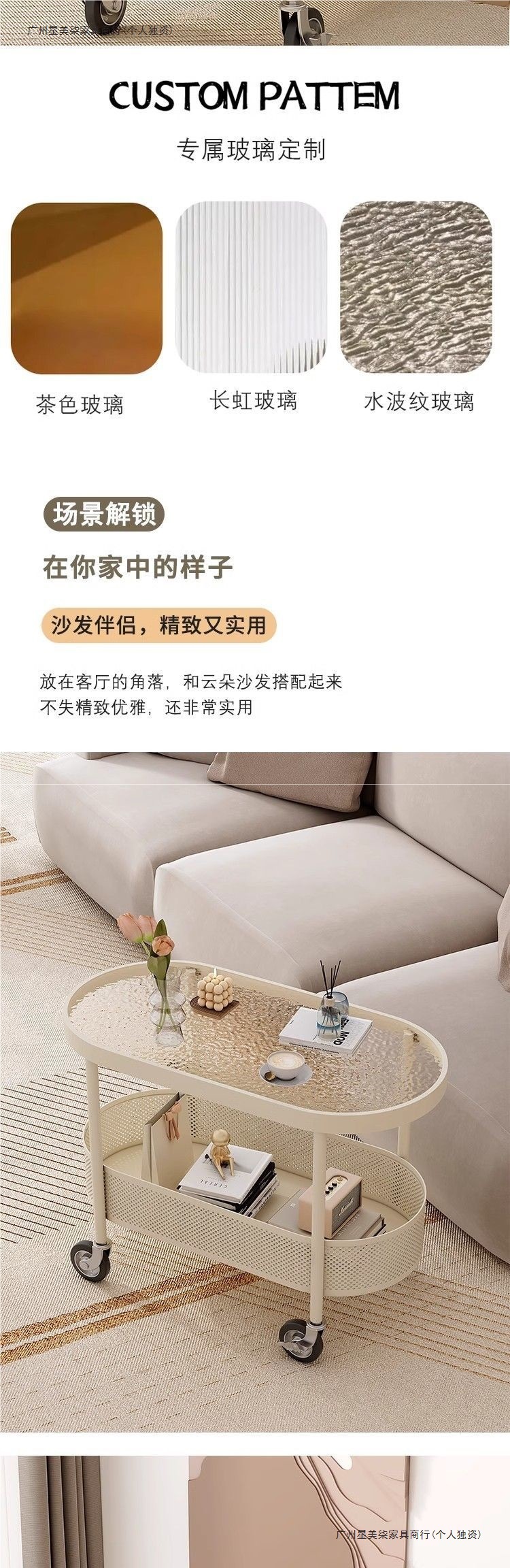 크림 스타일 현대적인 작은 아파트 거실 모바일 커피 테이블 소파 사이드 유리 바퀴가 달린 간단한 스토리지 트롤리