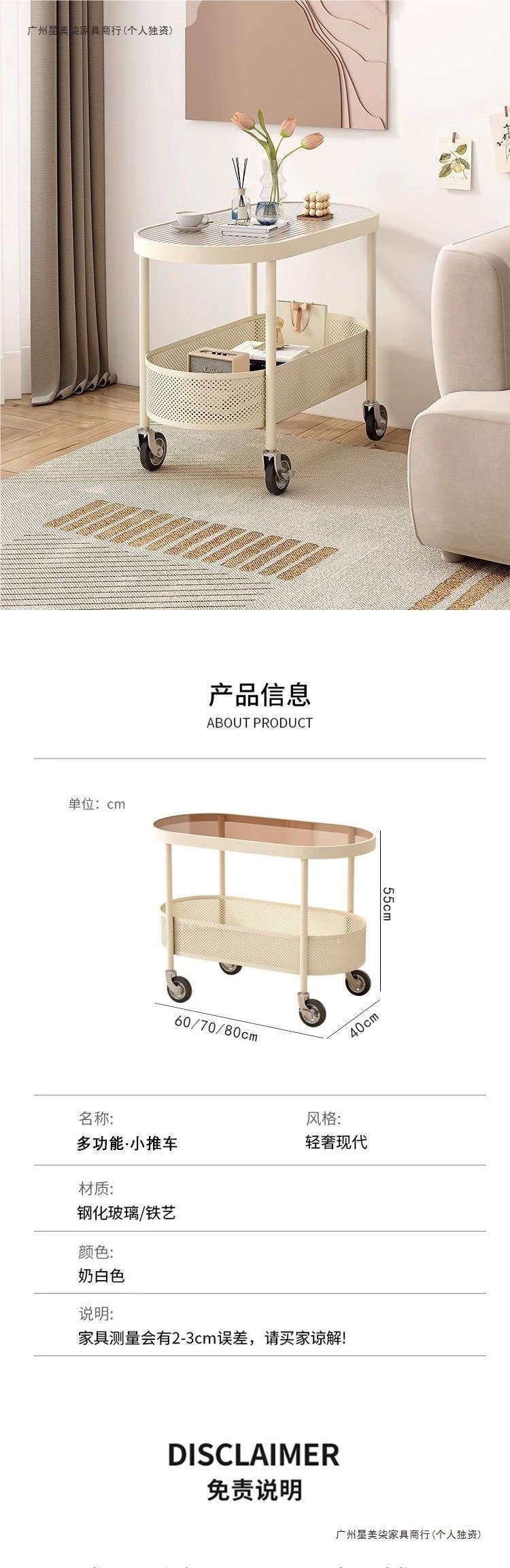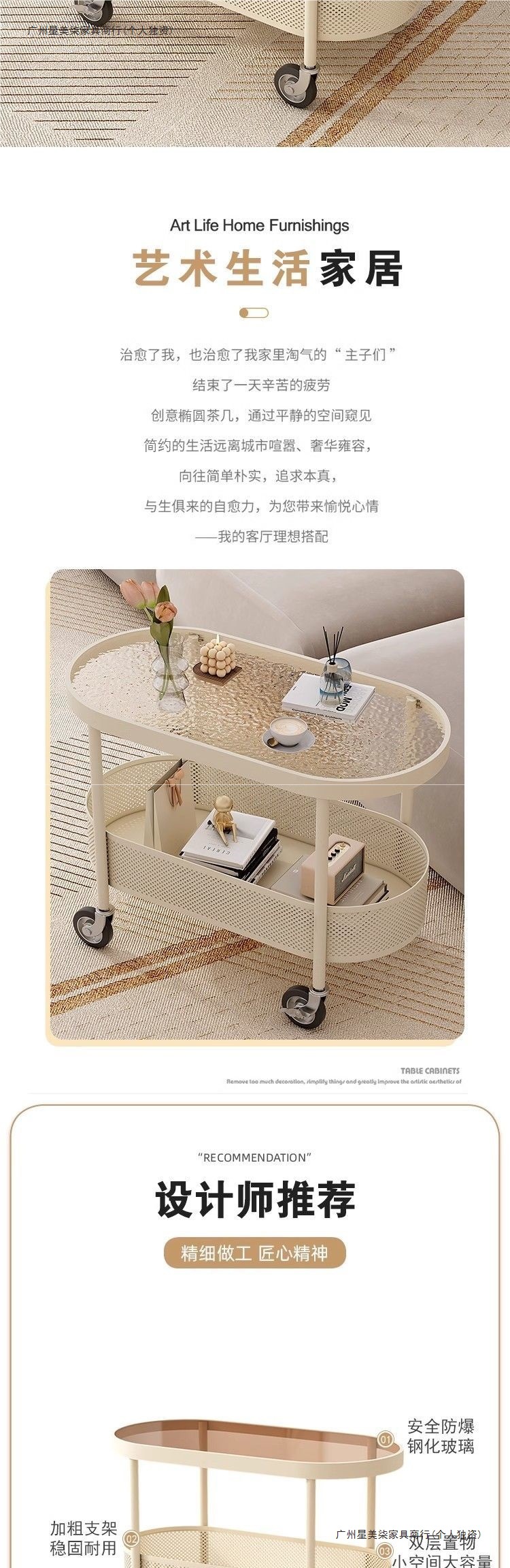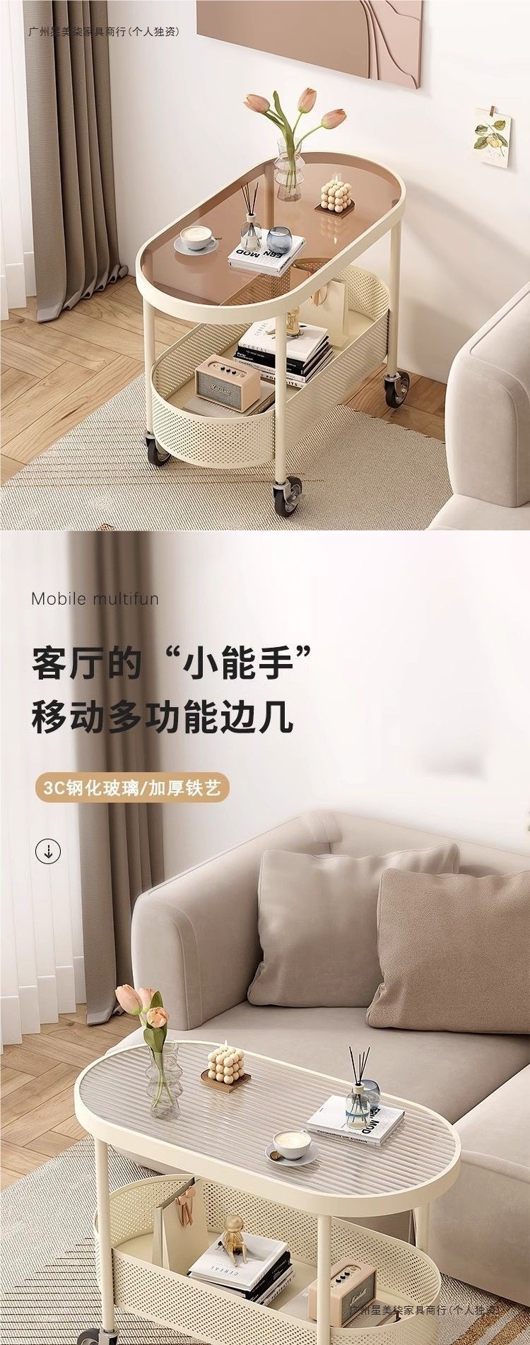 크림 스타일 현대적인 작은 아파트 거실 모바일 커피 테이블 소파 사이드 유리 바퀴가 달린 간단한 스토리지 트롤리