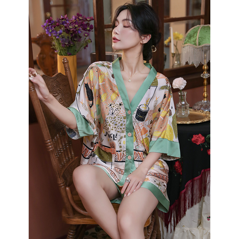 여성용 잠옷 여름 아이스 실크 오리지널 반팔 캐주얼 가디건 얇은 양복 루즈한 대형 홈웨어 외부 착용 가능스토어 가기