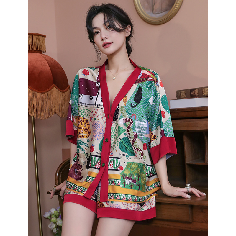 여성용 잠옷 여름 아이스 실크 오리지널 반팔 캐주얼 가디건 얇은 양복 루즈한 대형 홈웨어 외부 착용 가능
