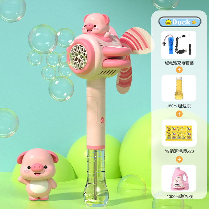 • 충전식 핑크 돼지 전기 풍차 버블 완드 [업그레이드된 리튬 배터리 버전] - 버블 머신 + 배터리 드라이버 + 농축 버블 액체 10팩