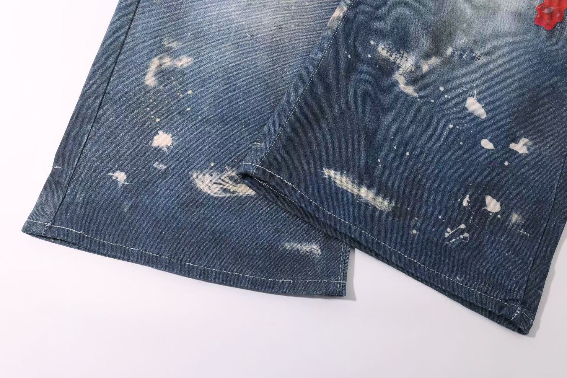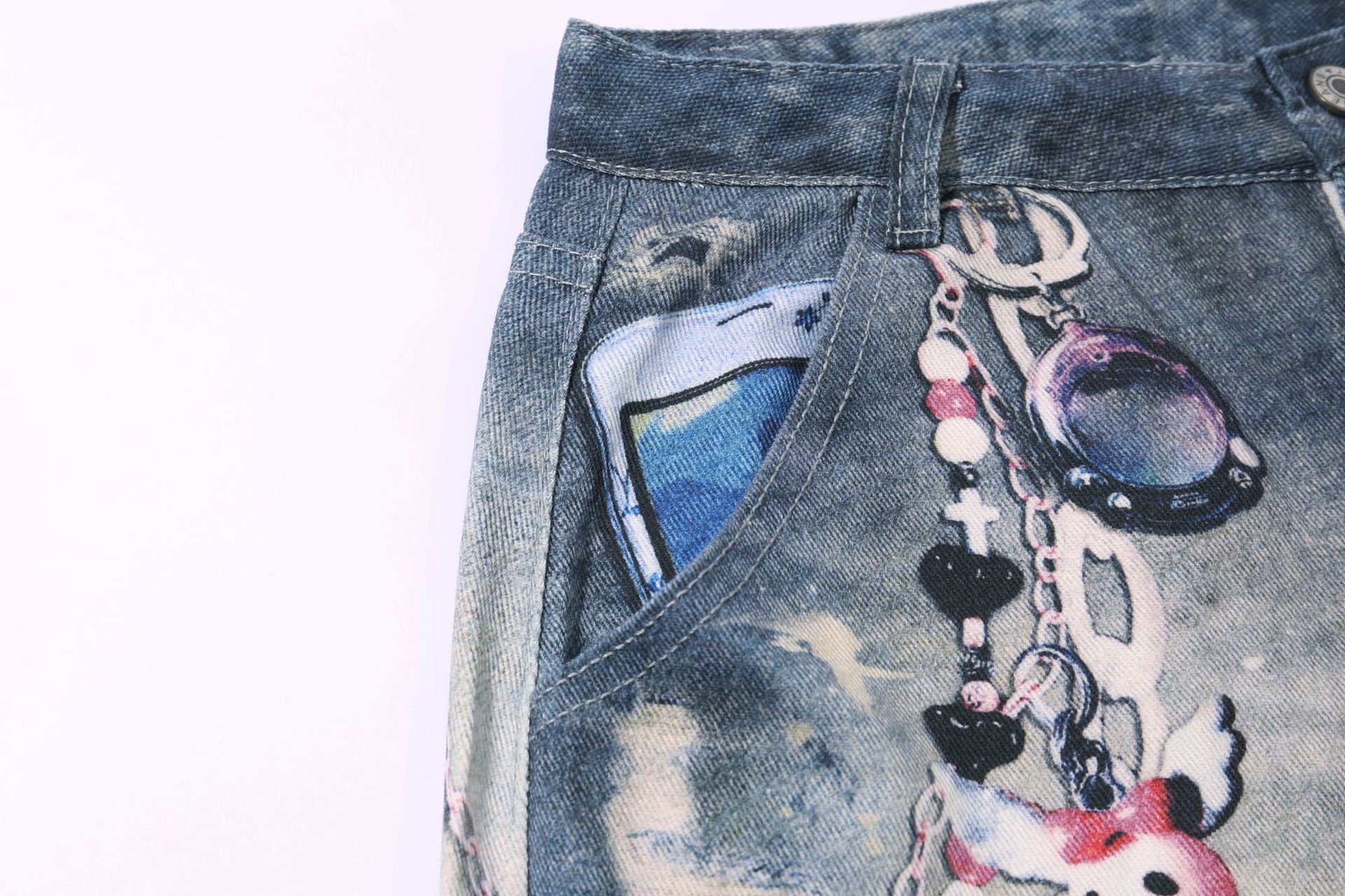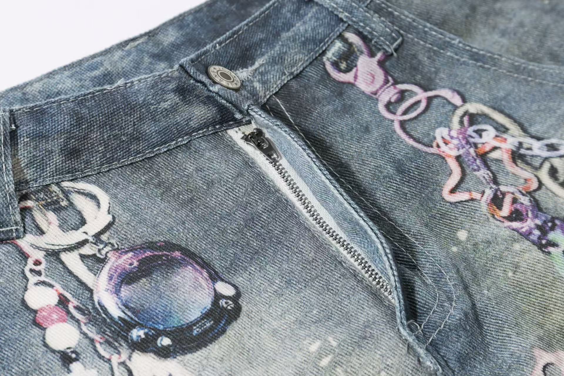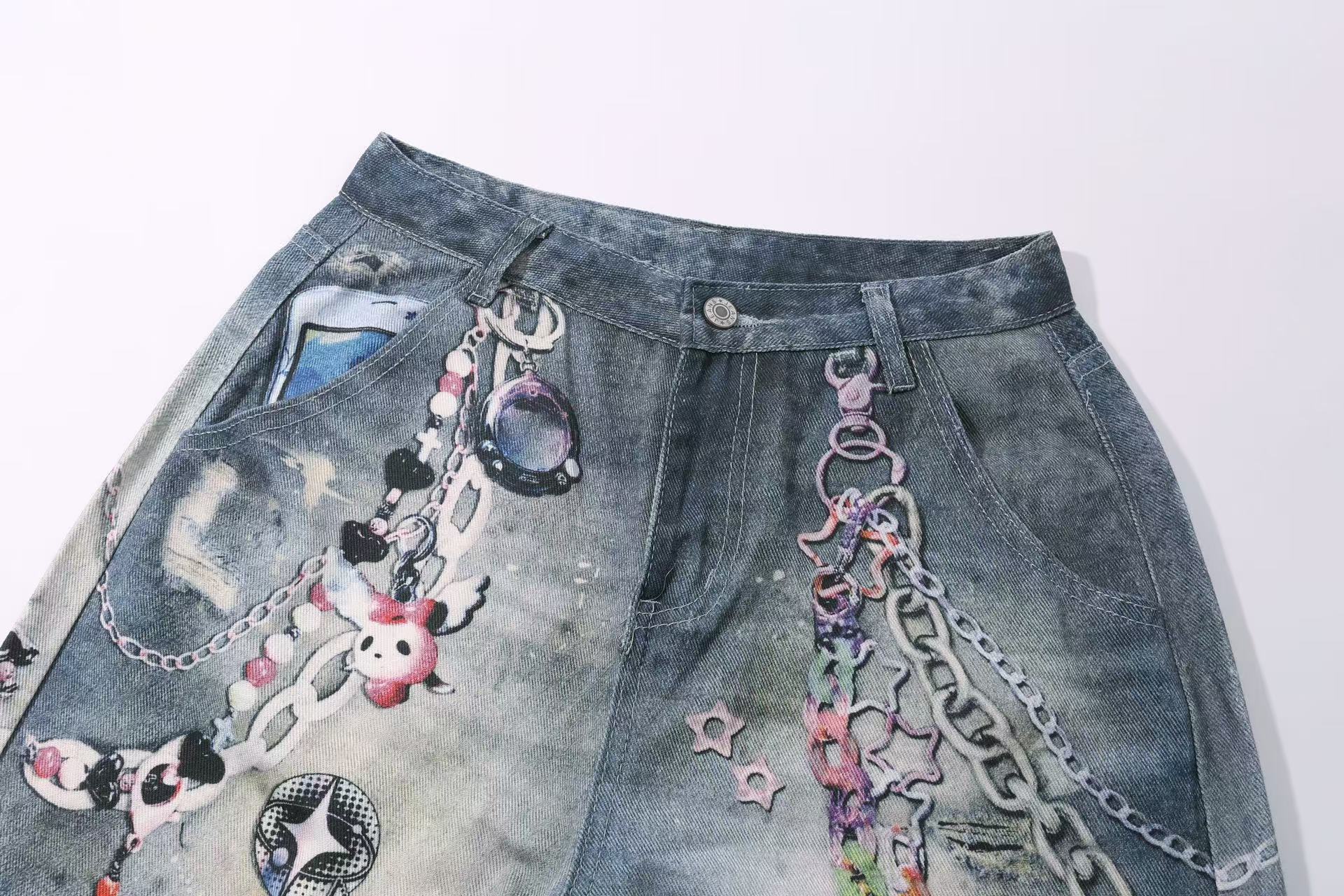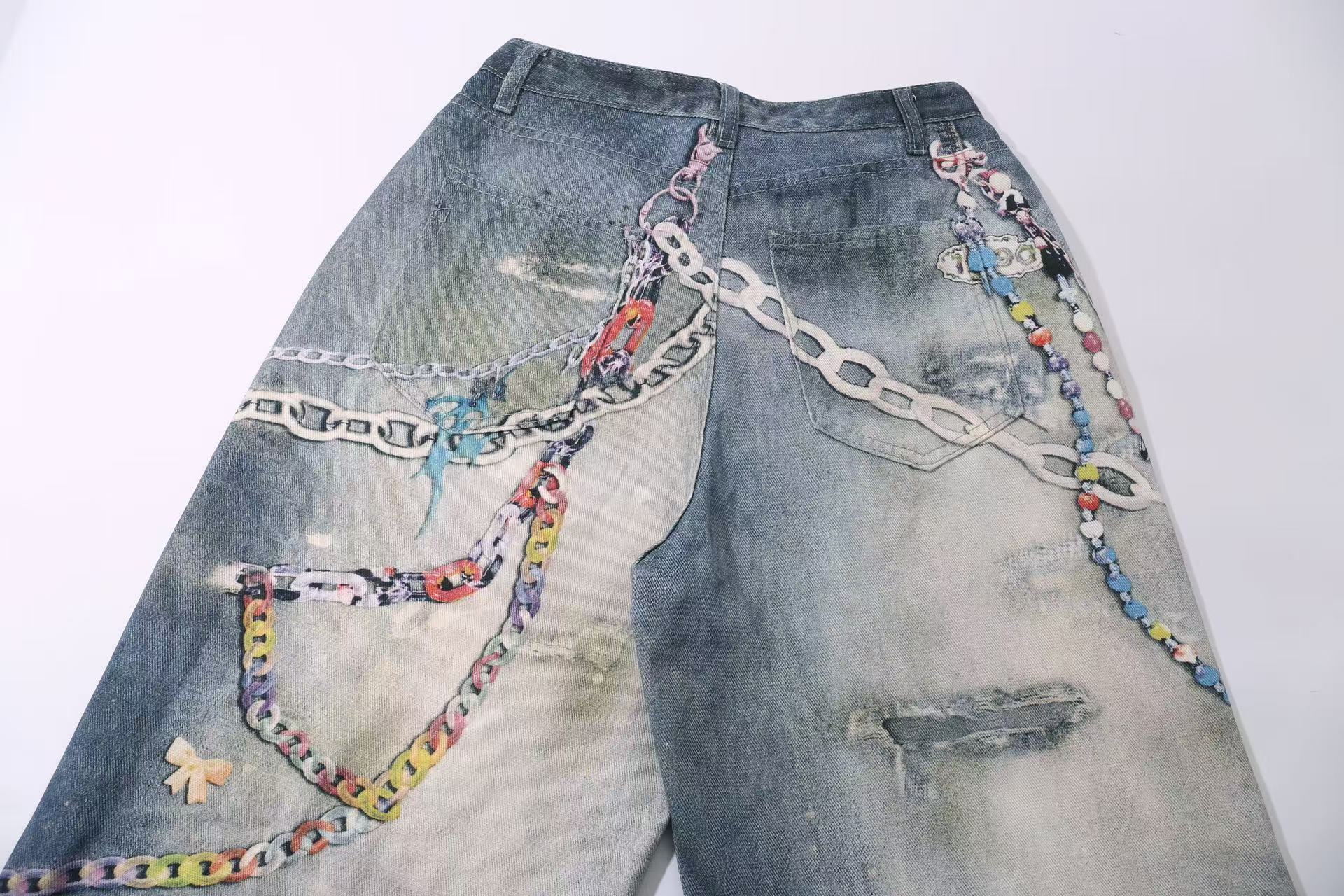 아메리칸 레트로 올드 웨이스트랜드 스타일 3D 프린트 체인 청바지 소년 하이 스트리트 패션 브랜드 루즈 와이드 레그 바닥 길이 바지스토어 가기